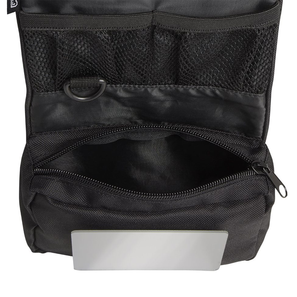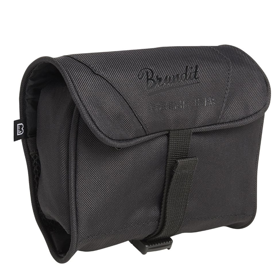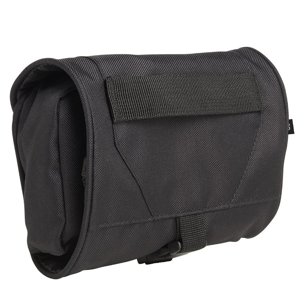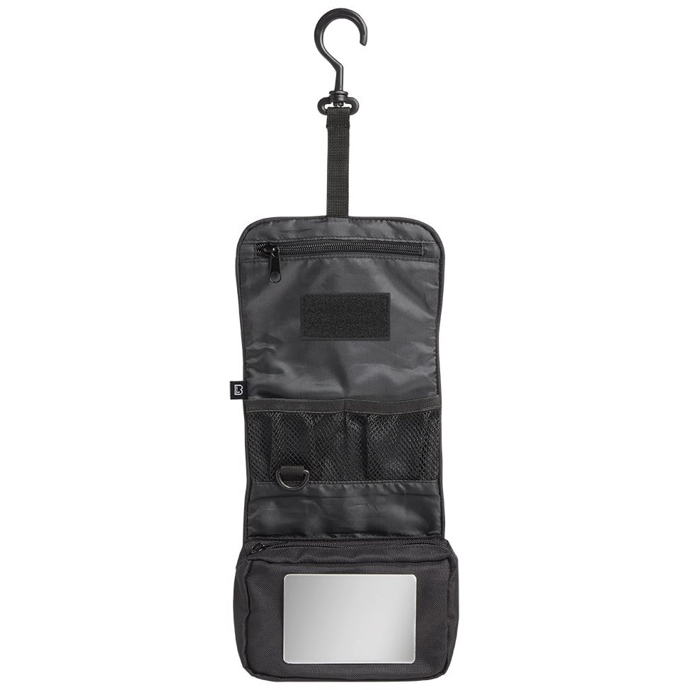 Sac pratique destiné principalement au rangement d'articles d'hygiène. L'étui est enroulable et, une fois fermé, il est maintenu en place à l'aide d'une sangle réglable en longueur avec une boucle en plastique. Une fois ouverte, vous trouverez à l'intérieur une poche assez spacieuse fermée par une fermeture éclair, un miroir incassable, un anneau en plastique en forme de D, deux compartiments ouverts en filet, une poche plate à fermeture éclair et un panneau velcro pour fixer des accessoires supplémentaires. L'ensemble de la trousse peut être suspendu grâce à un crochet en plastique.