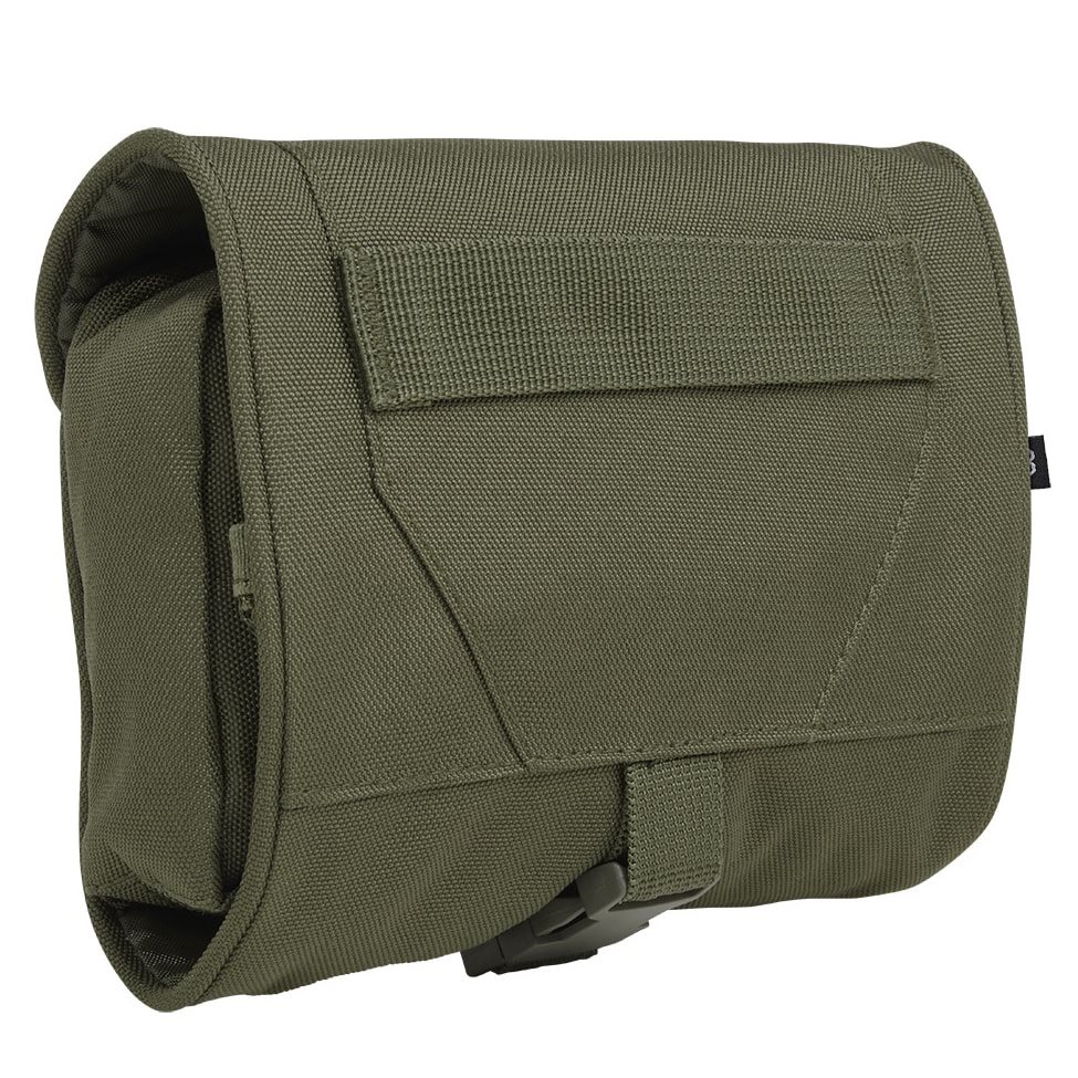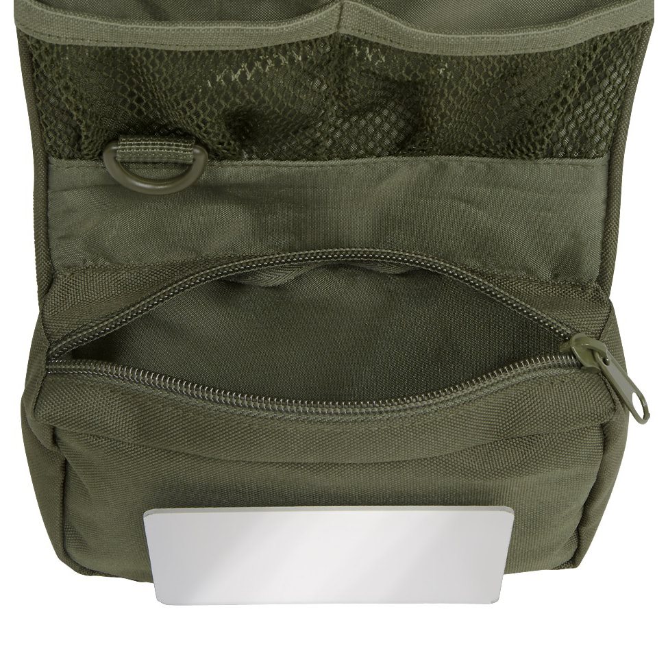 Sac pratique destiné principalement au rangement d'articles d'hygiène. L'étui est enroulable et, une fois fermé, il est maintenu en place à l'aide d'une sangle réglable en longueur avec une boucle en plastique. Une fois ouverte, vous trouverez à l'intérieur une poche assez spacieuse fermée par une fermeture éclair, un miroir incassable, un anneau en plastique en forme de D, deux compartiments ouverts en filet, une poche plate à fermeture éclair et un panneau velcro pour fixer des accessoires supplémentaires. L'ensemble de la trousse peut être suspendu grâce à un crochet en plastique.