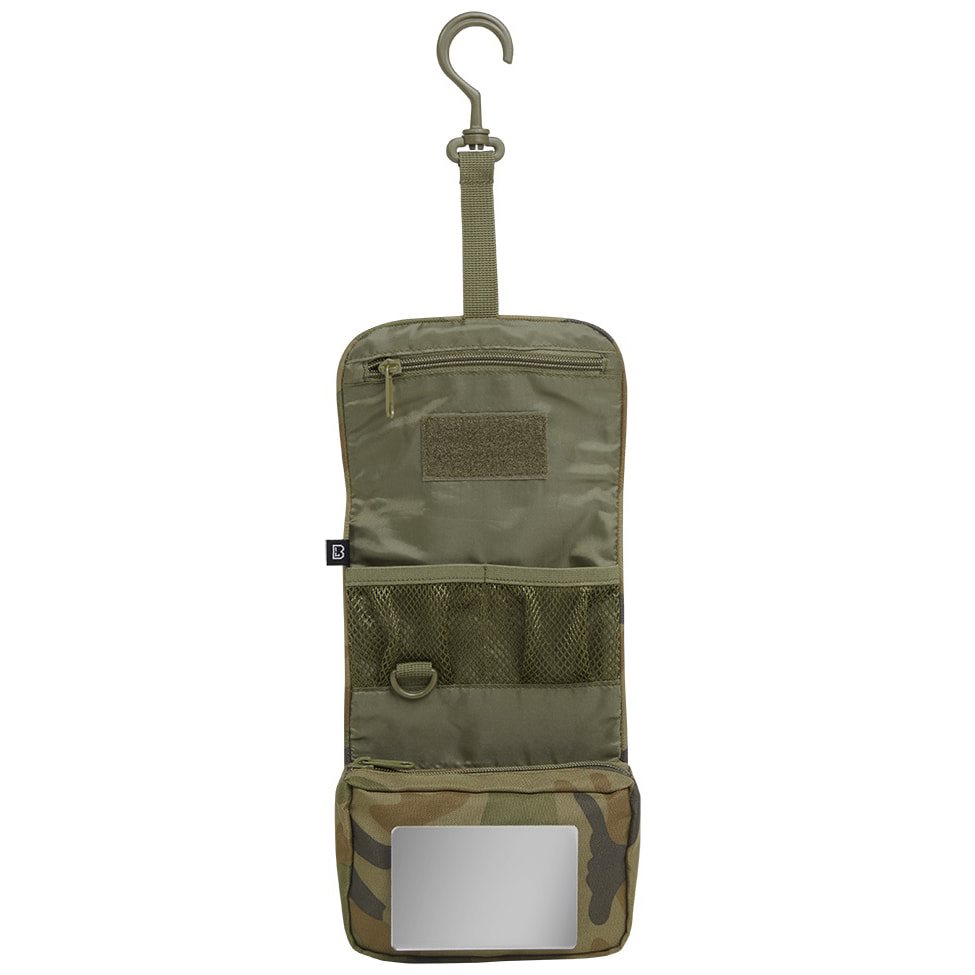 Sac pratique destiné principalement au rangement d'articles d'hygiène. L'étui est enroulable et, une fois fermé, il est maintenu en place à l'aide d'une sangle réglable en longueur avec une boucle en plastique. Une fois ouverte, vous trouverez à l'intérieur une poche assez spacieuse fermée par une fermeture éclair, un miroir incassable, un anneau en plastique en forme de D, deux compartiments ouverts en filet, une poche plate à fermeture éclair et un panneau velcro pour fixer des accessoires supplémentaires. L'ensemble de la trousse peut être suspendu grâce à un crochet en plastique.