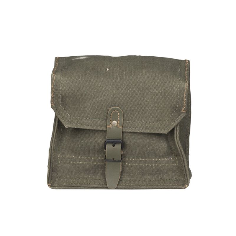 Sacoche historique vraisemblablement utilisée pour transporter des munitions. Elle est équipée d'une solide bandoulière en cuir. À l'intérieur, deux compartiments sont dotés d'un rabat en cuir. Fermeture par une boucle en cuir. Dimensions : environ 20 x 16 x 9 cm.