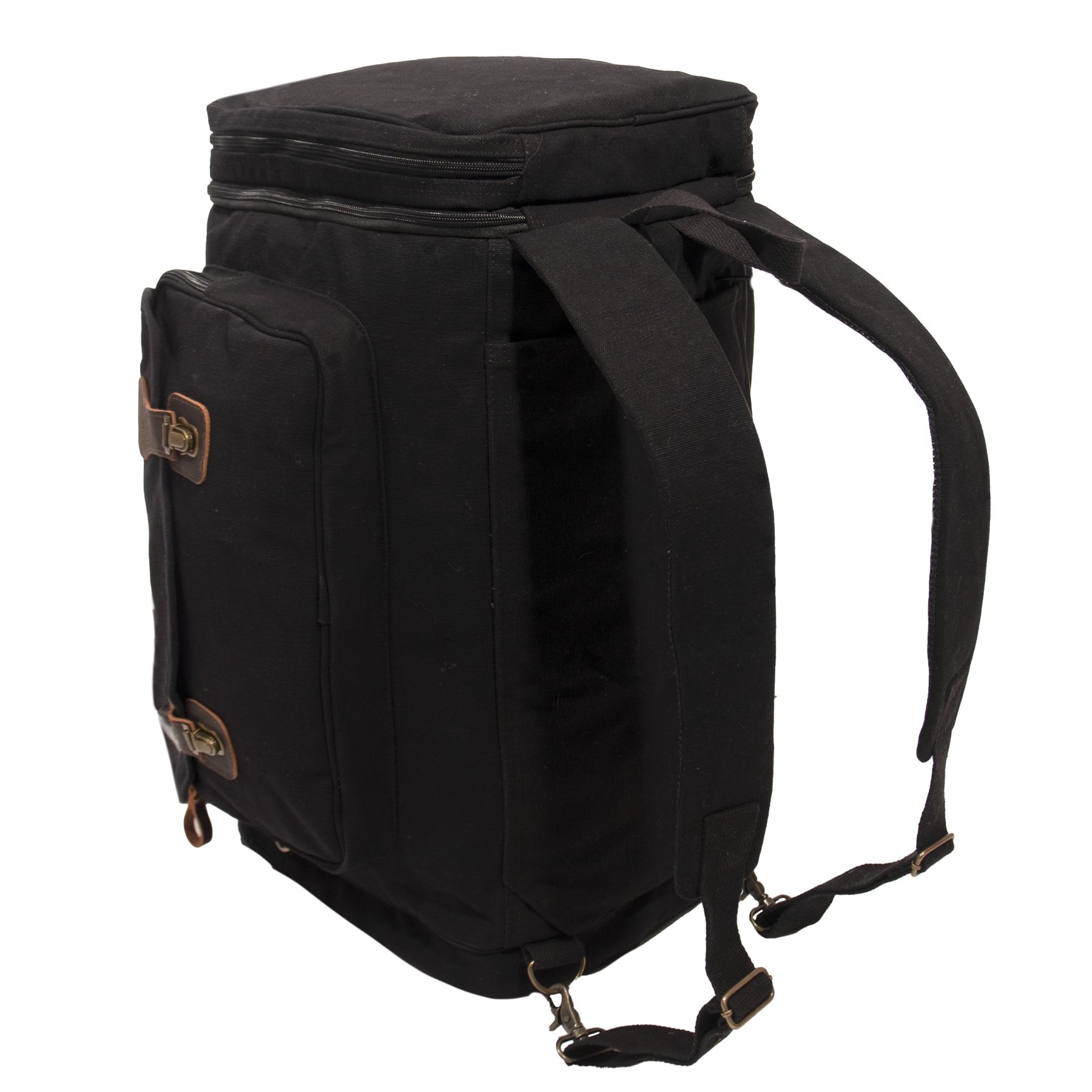 Sac de voyage pratique avec ouverture supérieure et latérale, pouvant être porté confortablement comme un sac à dos si nécessaire. Il est fabriqué en toile de coton résistante, complétée par des éléments fonctionnels en cuir et en laiton.