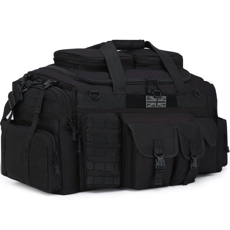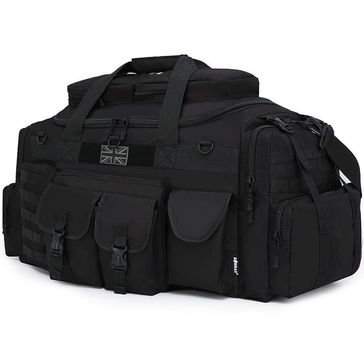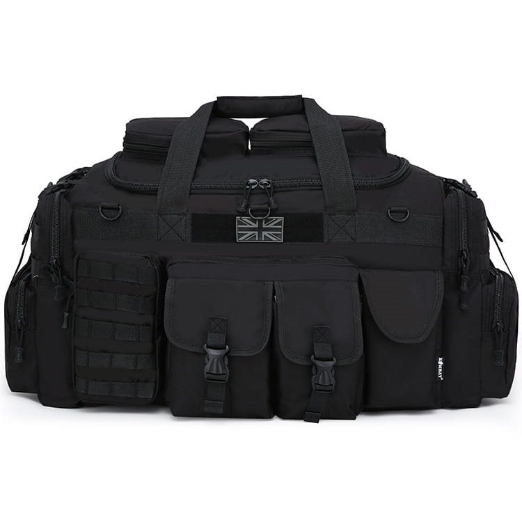 Sur le devant, il y a 5 poches au total : une poche plate à fermeture éclair sur laquelle sont placées deux poches à rabat avec une boucle en plastique. Sur le côté droit, il y a une poche à fermeture velcro, sur le côté gauche, il y a une poche à fermeture éclair qui comporte cinq sangles MOLLE sur le côté extérieur. Si nécessaire, vous pouvez y attacher d'autres petits équipements avec une attache MOLLE/PALS. Au milieu, au-dessus de la poche, il y a une poche à fermeture éclair. cinq sangles MOLLE. Si nécessaire, vous pouvez y attacher d'autres petits équipements avec une fixation MOLLE/PALS. Au milieu, au-dessus des poches, se trouve une bande de velcro avec un écusson représentant le drapeau britannique et trois anneaux en plastique en D. Les côtés du sac sont équipés de la même manière, vous y trouverez une grande poche sur tout le pourtour du côté. La poche se ferme à l'aide d'une fermeture éclair et comporte deux boucles en plastique sur la partie supérieure.