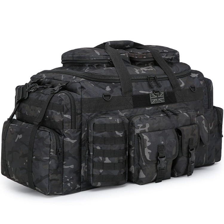 Sur le devant, il y a 5 poches au total : une poche plate à fermeture éclair sur laquelle sont placées deux poches à rabat avec une boucle en plastique. Sur le côté droit, il y a une poche à fermeture velcro, sur le côté gauche, il y a une poche à fermeture éclair qui comporte cinq sangles MOLLE sur le côté extérieur. Si nécessaire, vous pouvez y attacher d'autres petits équipements avec une attache MOLLE/PALS. Au milieu, au-dessus de la poche, il y a une poche à fermeture éclair. cinq sangles MOLLE. Si nécessaire, vous pouvez y attacher d'autres petits équipements avec une fixation MOLLE/PALS. Au milieu, au-dessus des poches, se trouve une bande de velcro avec un écusson représentant le drapeau britannique et trois anneaux en plastique. Les côtés du sac sont équipés de la même manière, vous y trouverez une grande poche sur tout le pourtour du côté. La poche se ferme à l'aide d'une fermeture éclair et comporte deux boucles à l'intérieur.