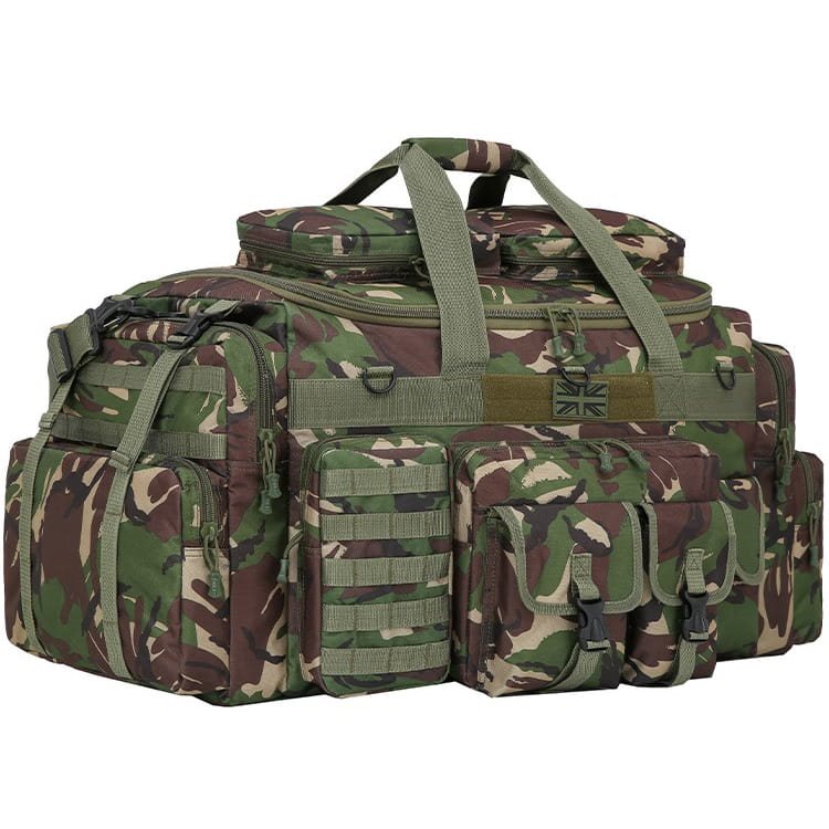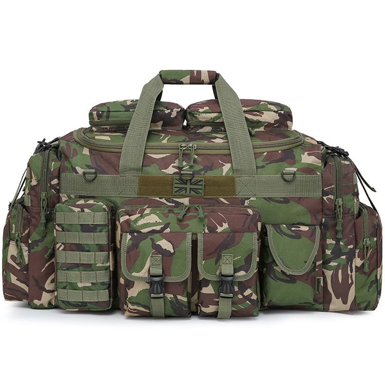 Sur le devant, il y a 5 poches au total : une poche plate à fermeture éclair sur laquelle sont placées deux poches à rabat avec une boucle en plastique. Sur le côté droit, il y a une poche à fermeture velcro, sur le côté gauche, il y a une poche à fermeture éclair qui comporte cinq sangles MOLLE sur le côté extérieur. Si nécessaire, vous pouvez y attacher d'autres petits équipements avec une attache MOLLE/PALS. Au milieu, au-dessus de la poche, il y a une poche à fermeture éclair. cinq sangles MOLLE. Si nécessaire, vous pouvez y attacher d'autres petits équipements avec une fixation MOLLE/PALS. Au milieu, au-dessus des poches, se trouve une bande de velcro avec un écusson représentant le drapeau britannique et trois anneaux en plastique en D. Les côtés du sac sont équipés de la même manière, vous y trouverez une grande poche sur tout le pourtour du côté. La poche se ferme par une fermeture éclair et comporte deux boucles en plastique sur la partie supérieure.