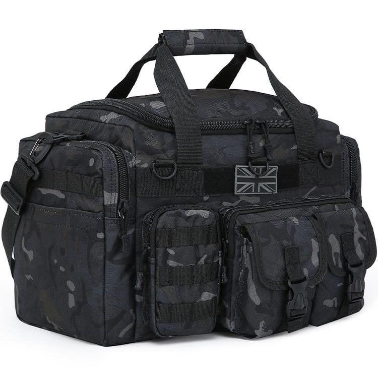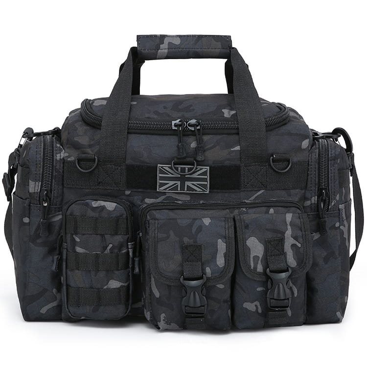 Il y a au total 4 poches à l'avant : une poche plate à fermeture éclair, sur laquelle se trouvent deux poches à rabat avec une boucle en plastique. Sur le côté gauche, il y a une poche zippée qui comporte cinq sangles MOLLE à l'extérieur. Si nécessaire, vous pouvez y attacher d'autres petits équipements avec une fixation MOLLE/PALS. Au milieu, au-dessus des poches, se trouve une bande de velcro avec un écusson représentant le drapeau britannique et trois anneaux en plastique en forme de D.