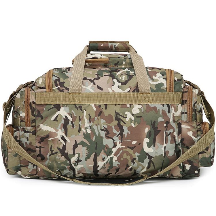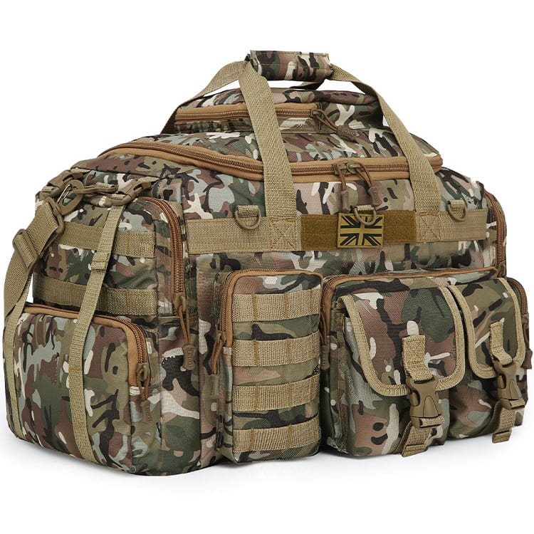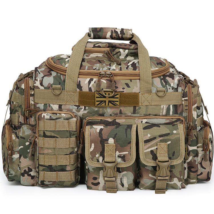 Les côtés du sac sont symétriques et comportent deux poches séparées accessibles par fermeture éclair. La poche supérieure est également équipée de deux rangées de sangles modulaires standard MOLLE/PALS.