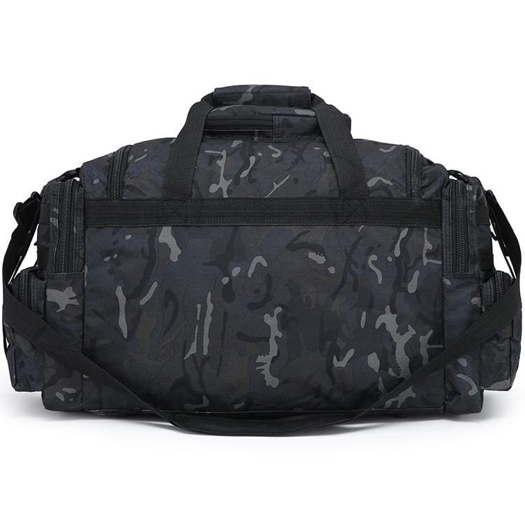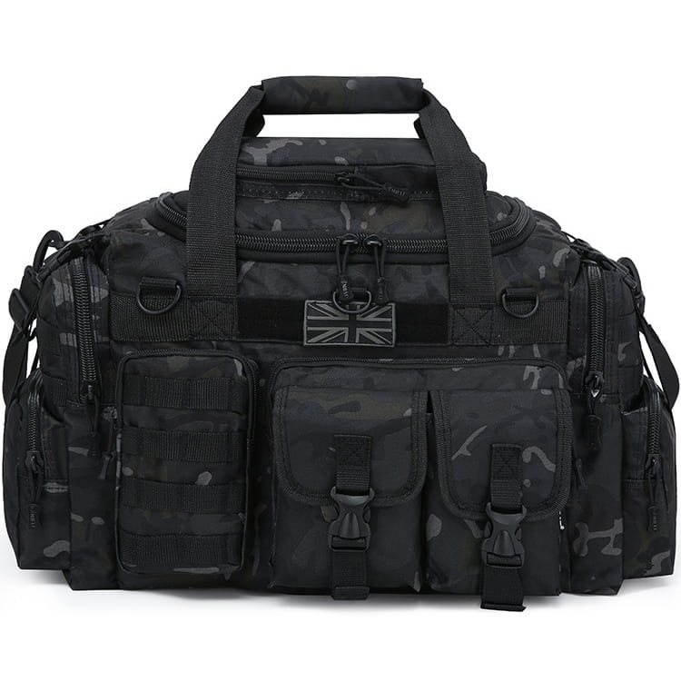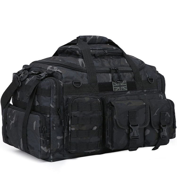 Les côtés du sac sont symétriques et comportent deux poches séparées accessibles par fermeture éclair. La poche supérieure est également équipée de deux rangées de sangles modulaires standard MOLLE/PALS.