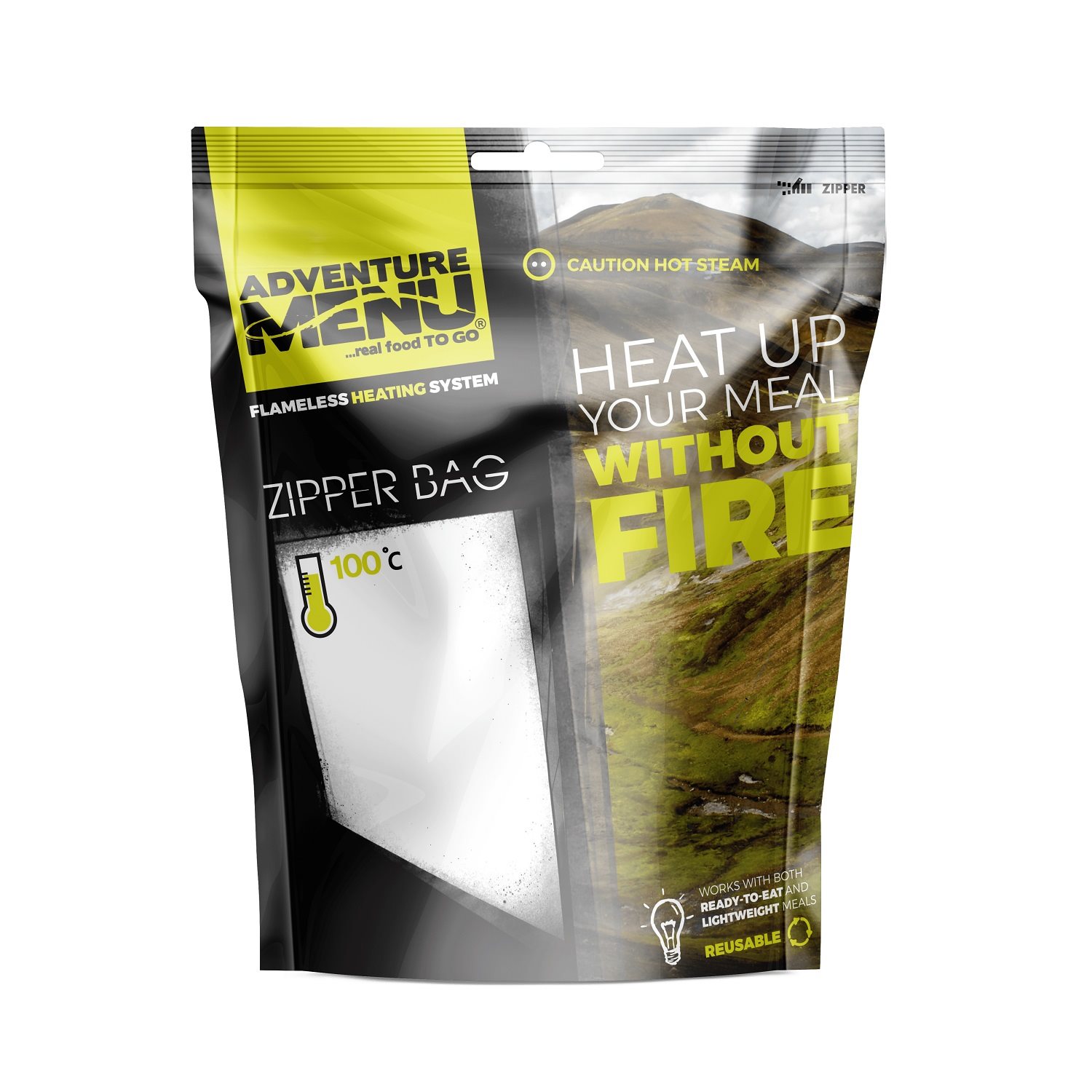 Le sachet Zipper bag est un sachet spécial dans lequel vous pouvez réchauffer vos repas à l'aide des capsules auto-chauffantes AdventureMenu. Plus d'informations