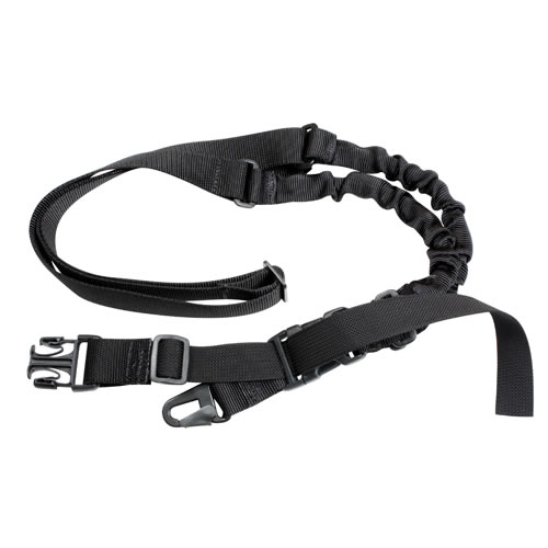 Sangle d'arme réglable à un point d'attache avec double section élastique. Mousqueton métallique et boucle Fastex. Largeur de la sangle : 31 mm, matériau : nylon.
