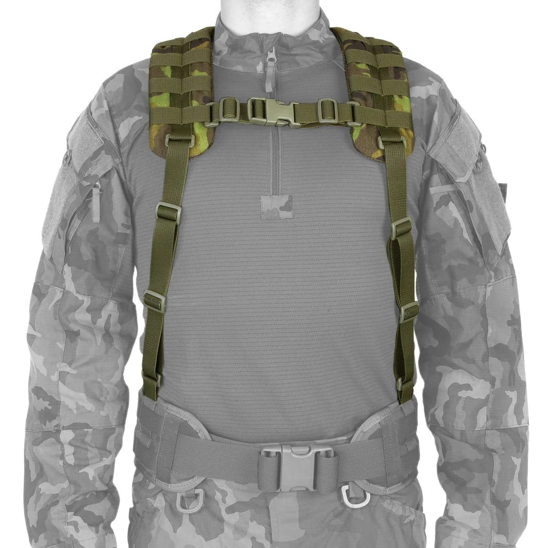 Les sangles tactiques TP-2 sont conçues pour être utilisées avec une ceinture tactique ou de service. Elles transfèrent une partie du poids porté par la ceinture des hanches vers les épaules. Elles présentent une conception simple en forme de H et offrent une large gamme de réglages, ce qui permet de les adapter aux besoins de l'utilisateur. La partie épaulière des sangles comprend une doublure cousue qui répartit la charge sur les épaules. Une bande MOLLE est cousue sur les parties épaulière et dorsale pour fixer d'autres équipements. Les sangles tactiques TP-2 sont équipées d'une poignée d'évacuation et d'une sangle pectorale.