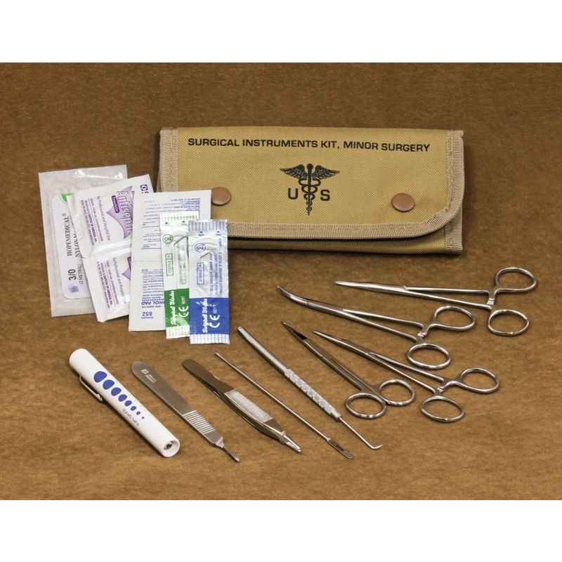 Ensemble chirurgical US comprenant 12 instruments médicaux différents ainsi que des accessoires supplémentaires. Le tout est rangé dans une trousse en tissu. Matériau des instruments : acier inoxydable. Plus d'informations
