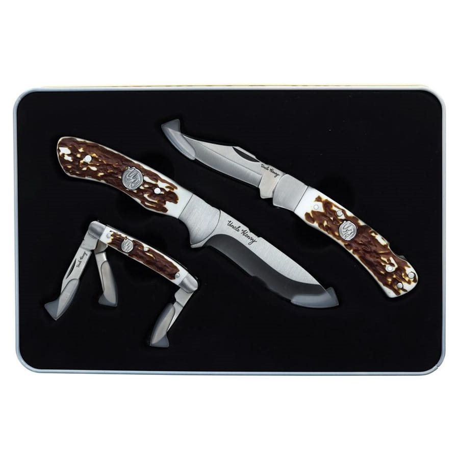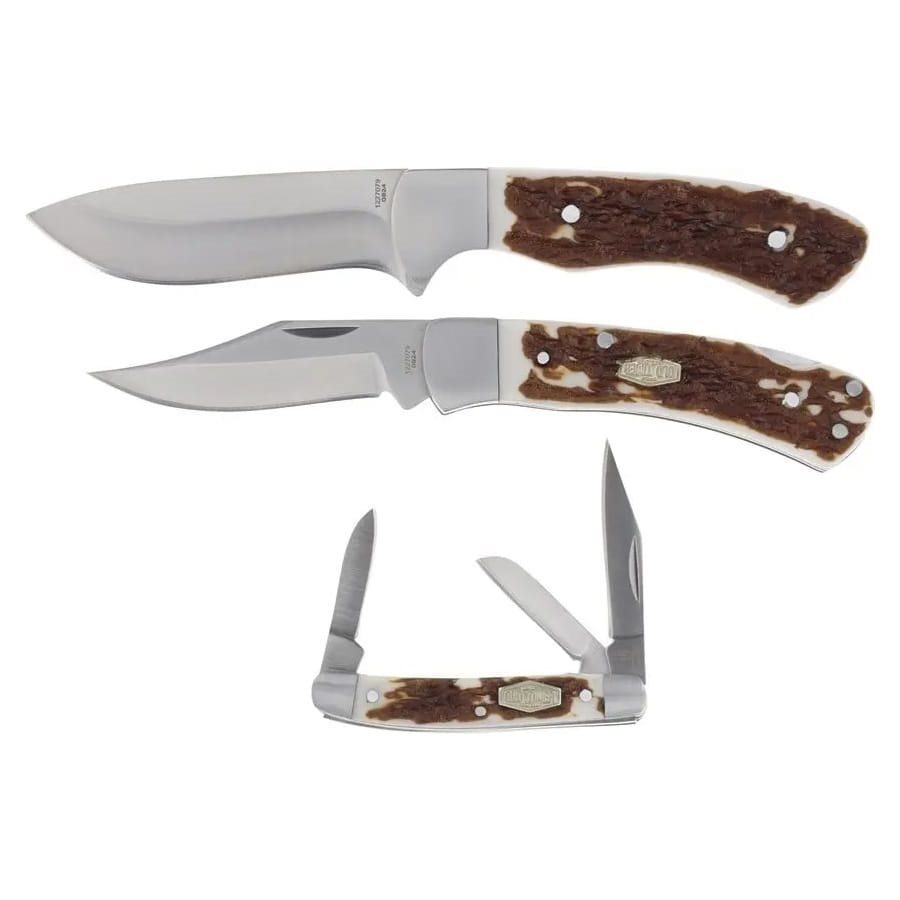 Ensemble de trois couteaux en acier inoxydable livrés dans un coffret cadeau en acier inoxydable. Les trois couteaux sont dotés d'un manche élégant en Delrin, dont l'aspect rappelle celui de la corne. L'ensemble comprend un couteau à lame fixe, un couteau pliant et un couteau multifonctions.