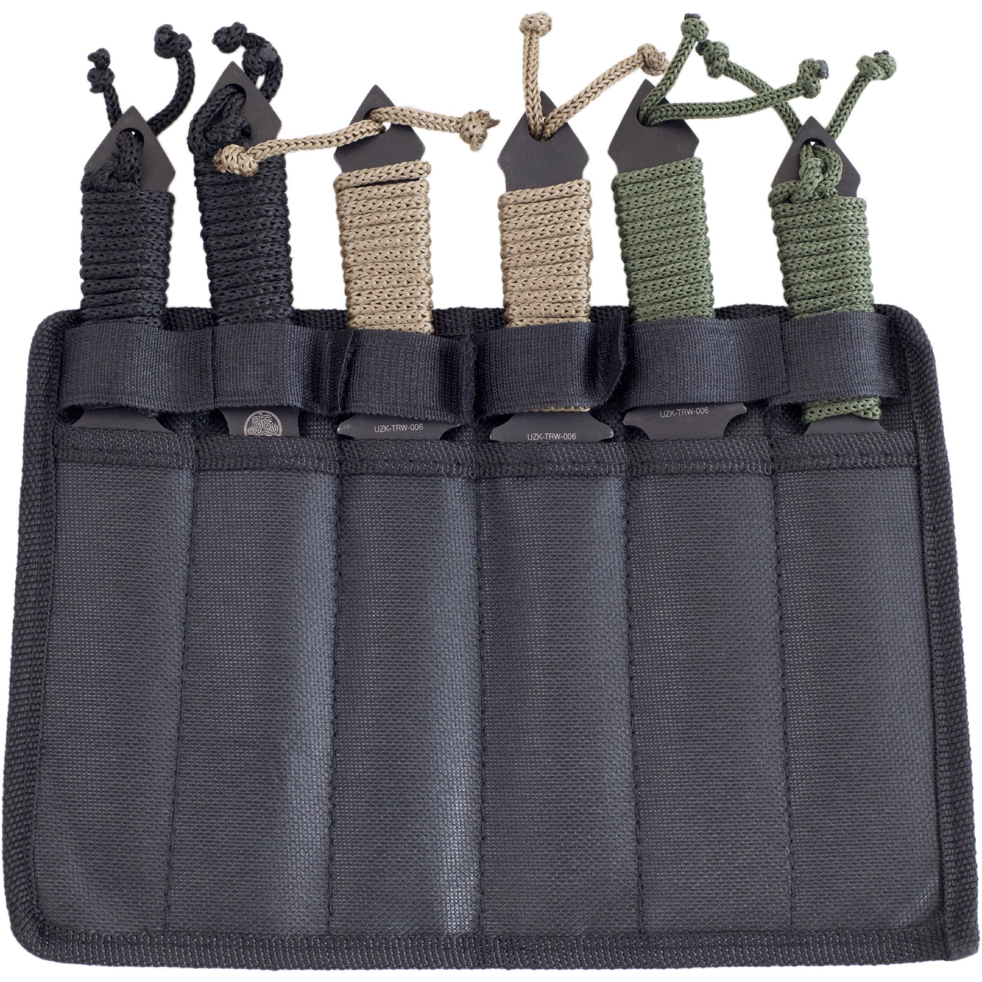 Ensemble de six couteaux de lancer à lame lisse. Les couteaux sont fabriqués en acier inoxydable, partiellement noircis et gravés des noms des clans samouraïs sur la lame. Les manches des couteaux sont recouverts d'une cordelette verte, noire ou sable. Les couteaux sont livrés avec un étui en polyester.