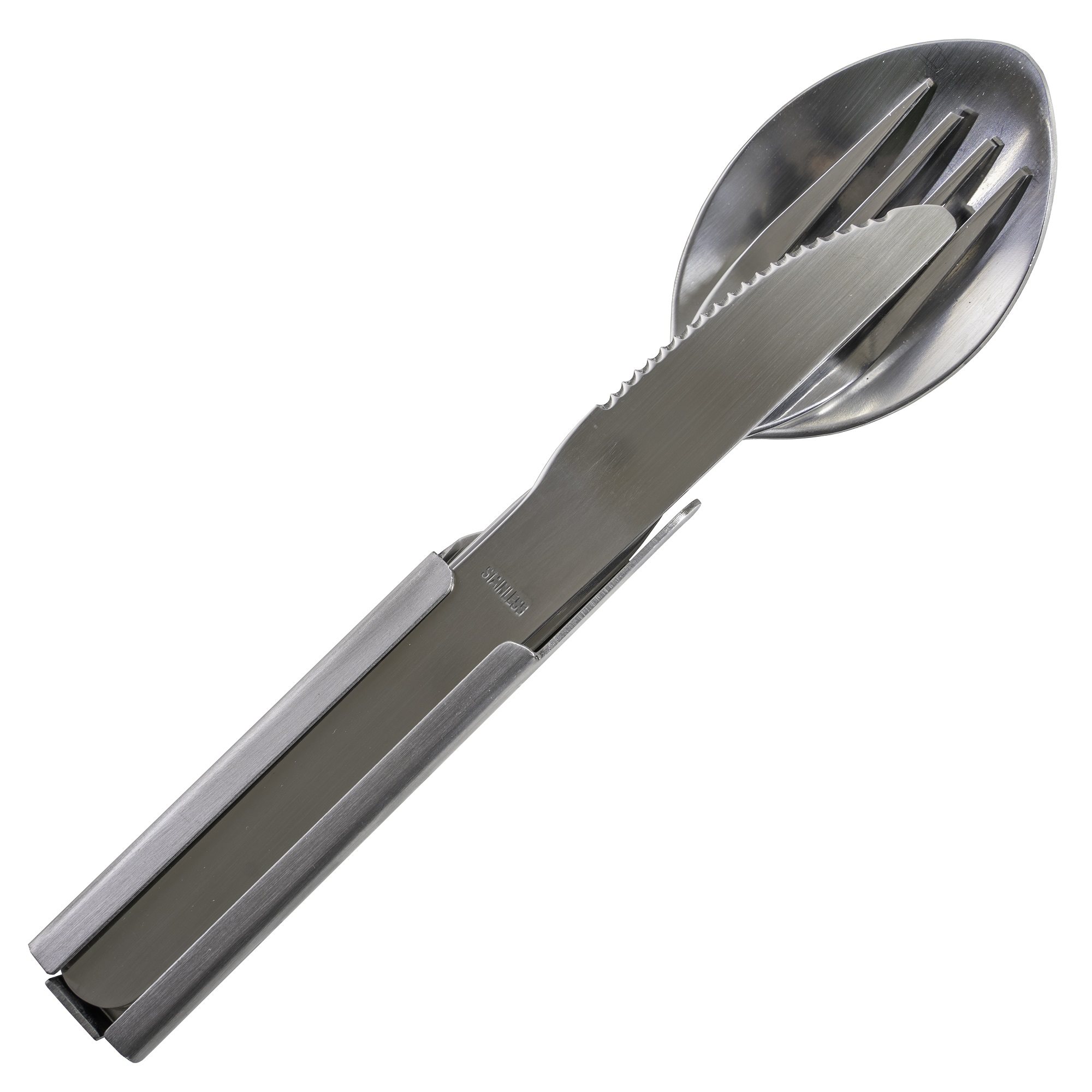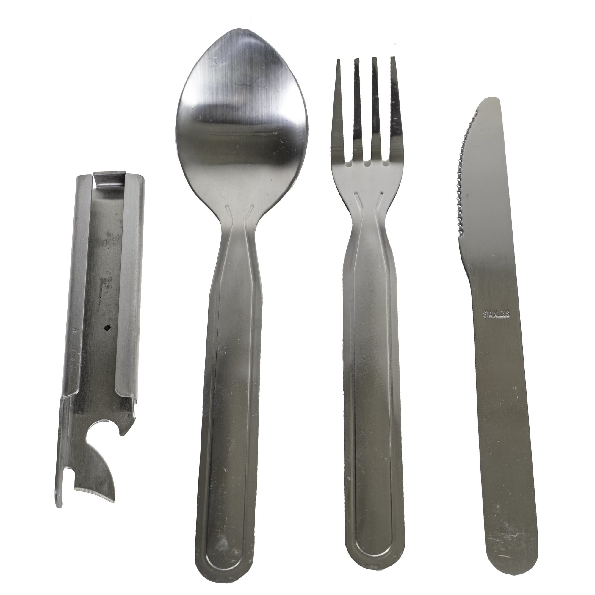 Comprend : une cuillère, une fourchette, un couteau et un ouvre-boîte et décapsuleur. Longueur : 19,8 cm. Matériau : acier inoxydable. Poids : 140 grammes. Plus d'informations