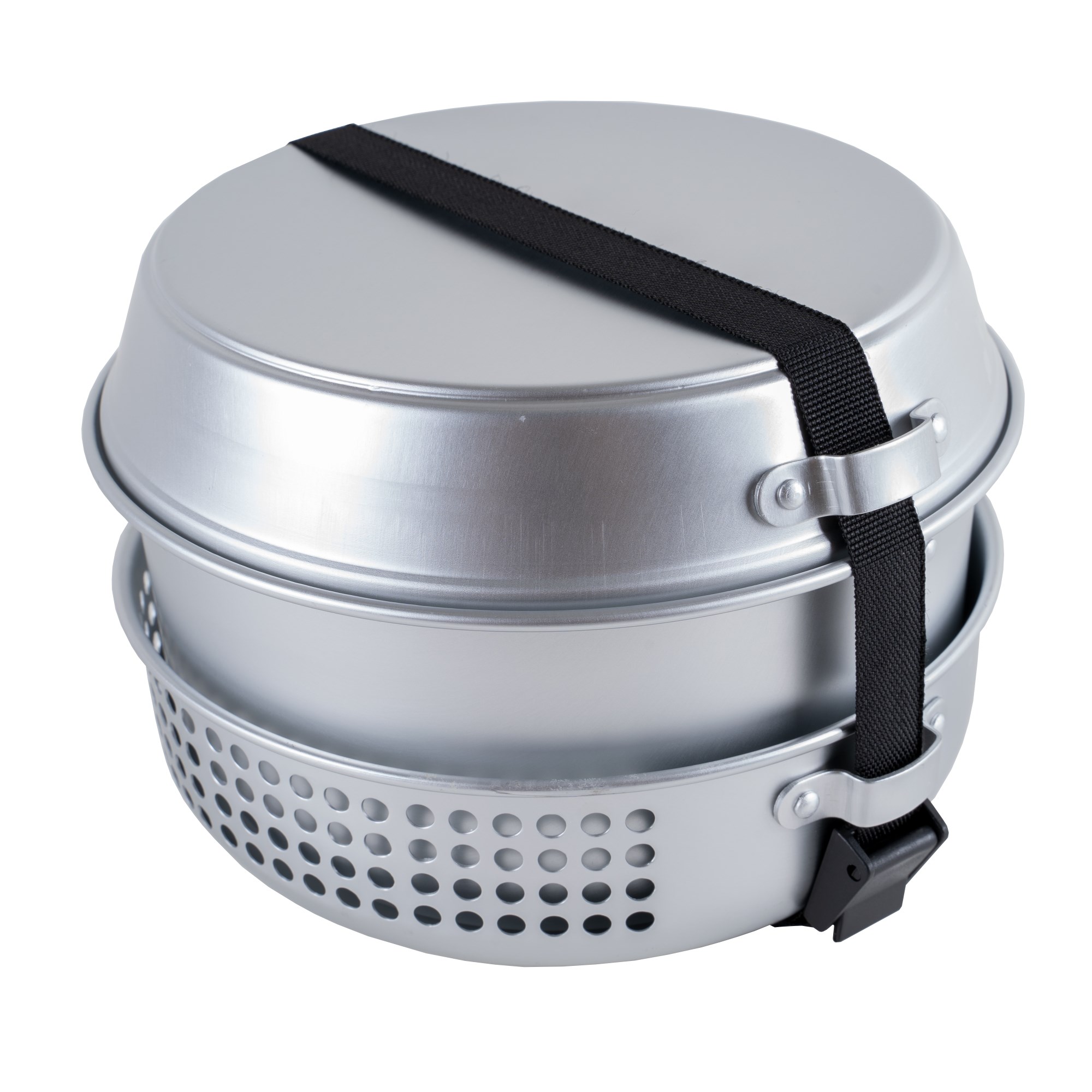 Ensemble de cuisine en aluminium composé de neuf pièces. L'ensemble peut être replié de manière compacte dans un emballage de 22 cm de diamètre et 15 cm de hauteur. Livré avec une sangle de serrage.