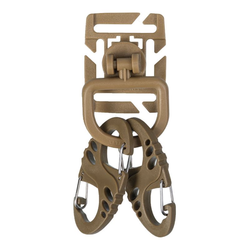 Ensemble tactique pratique composé d'une paire de mousquetons en S et d'une fixation Duraflex. Cette fixation comprend une plateforme et un anneau en D amovible. Elle est entièrement compatible avec le système de fixation modulaire MOLLE/PALS et l'anneau pivote à 360°.