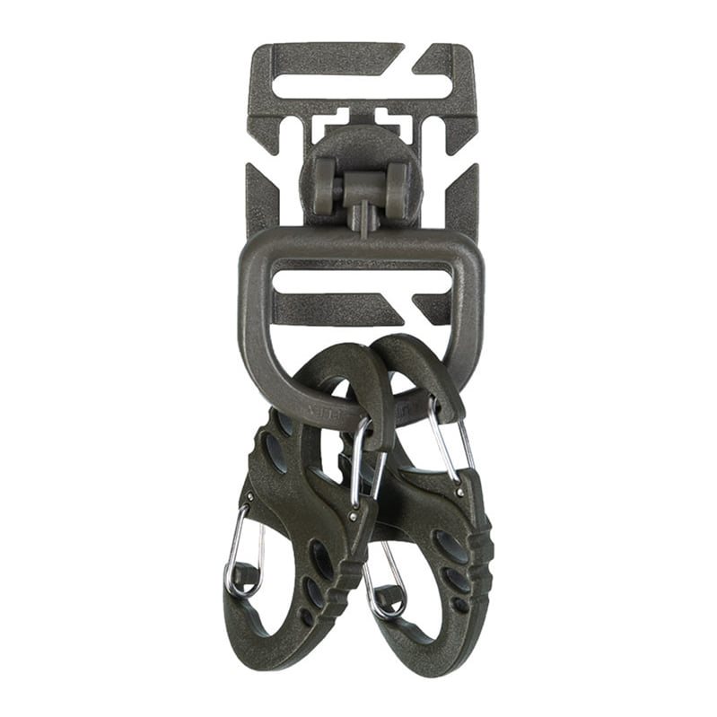 Ensemble tactique pratique composé d'une paire de mousquetons en S et d'une fixation Duraflex. Cette fixation comprend une plateforme et un anneau en D amovible. Elle est entièrement compatible avec le système de fixation modulaire MOLLE/PALS et l'anneau pivote à 360°.