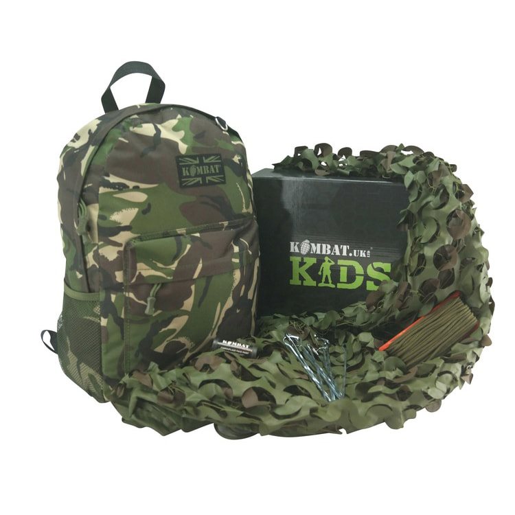 Le kit comprend un sac à dos, un filet de camouflage, de la peinture de camouflage, des piquets de tente et une corde. Le tout est rangé dans une boîte cadeau.