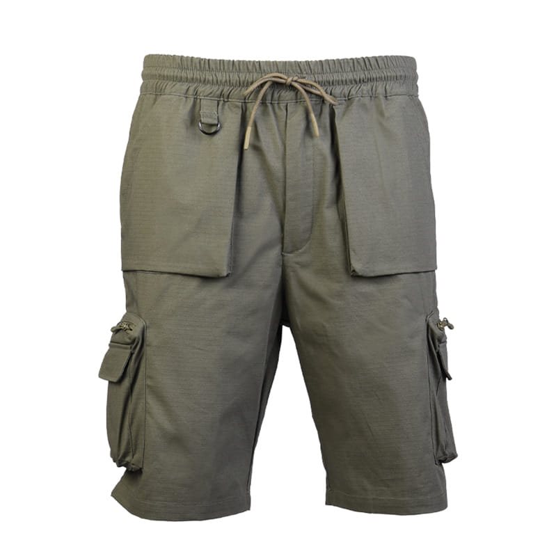 Short de loisirs confortable, confectionné dans un tissu en coton agréable au toucher, avec un traitement rip-stop indéchirable. La taille est élastique et peut être ajustée à l'aide d'un cordon intégré. Elle est dotée d'un anneau métallique en D sur le côté droit à l'avant. Les poches kangourou sont très spacieuses et peuvent facilement contenir un portefeuille, des documents ou d'autres objets de taille similaire. Les poches cargo sur les cuisses se ferment à l'aide de fermetures éclair YKK et sont dotées à l'extérieur de trois petites poches à rabat avec fermeture velcro. Deux poches de taille moyenne sont situées sur les fesses, elles sont également fermées par un rabat à velcro.