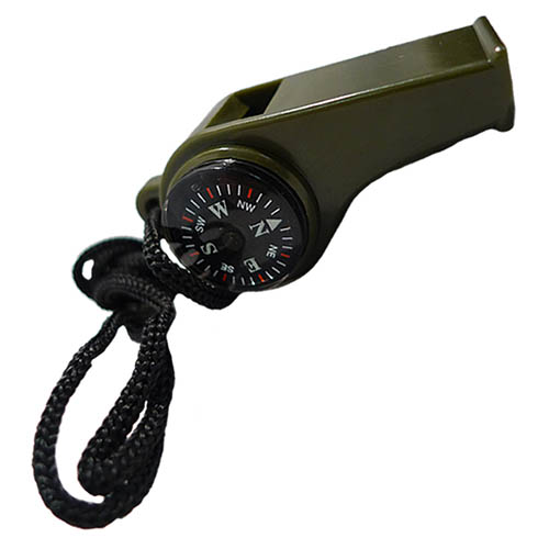 Sifflet de survie avec boussole et thermomètre intégrés. Le produit est fourni avec un cordon noir pour être porté autour du cou.
