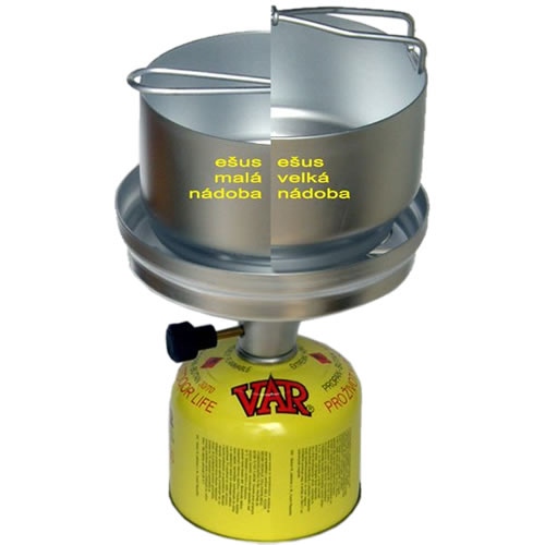 Un accessoire important du réchaud VAR2 est le pare-vent amovible, qui a été repensé pour pouvoir servir, dans la position opposée, de support stabilisateur pour l'ensemble cartouche-réchaud. Dans la pratique, en particulier par temps venteux, cela permet de réaliser des économies de combustible considérables, pouvant atteindre 25 %. Le pare-vent protège efficacement la flamme des rafales de vent et sa grande surface réfléchissante renvoie toute la chaleur des gaz de combustion sous le récipient de cuisson. Il est très facile à installer et à retirer, le réchaud reste compact et le poids du pare-vent est négligeable par rapport aux économies de combustible réalisées. Le pare-vent est parfaitement compatible avec le set de table en trois parties, connu sous le nom d'esus, et ne prend donc pratiquement pas de place par rapport au poids du combustible économisé. Un autre avantage important est la grande facilité de montage et de démontage du pare-vent, ce qui permet de conserver la compacité du réchaud lui-même. Fonction STABILISATEUR ou trépied pour cartouche : la cartouche avec le réchaud se fixe très facilement sur le côté opposé du pare-vent, ce qui renforce considérablement la résistance au renversement. Ceux qui ont déjà vu leur soupe cuite se renverser dans l'herbe juste avant de pouvoir la déguster savent de quoi il s'agit.