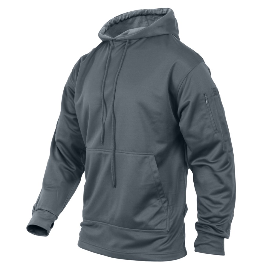 Sweat-shirt tactique avec poche avant intégrée pour les mains, également appelée « poche kangourou », est spécialement conçue pour les porteurs d'armes de poing. Ce qui la distingue des autres sweats à capuche, c'est l'ouverture dans la poche avant. En cas de besoin, vous pouvez discrètement accéder à l'arme attachée à votre ceinture sans que l'agresseur ne s'en aperçoive. Le sweat à capuche est doté d'une poche zippée sur chaque manche, d'un panneau velcro sur la poche droite pour y apposer des écussons, et d'une poche supplémentaire sur la poche gauche.