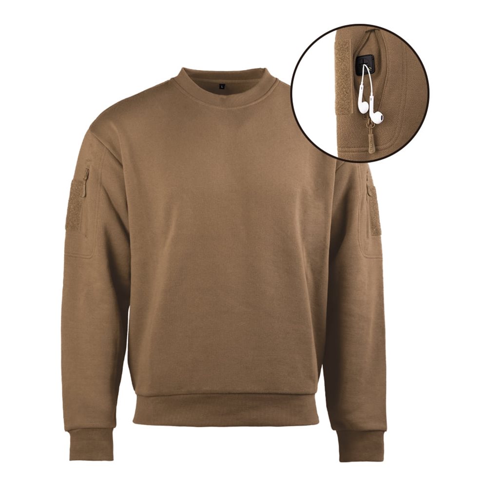 Sweat-shirt / pull à l'allure sportive. Il est confectionné dans un tissu très agréable au toucher, composé à 60 % de coton et à 40 % de polyester, qui tient parfaitement chaud. Le sweat-shirt est doté de deux petites poches sur les épaules, fermées par des fermetures éclair verticales. Les poches sont également combinées avec des bandes velcro, ce qui vous permet de personnaliser facilement et rapidement le sweat-shirt à l'aide d'écussons VELCRO. À l'intérieur, vous trouverez des passages pour les écouteurs. L'ourlet inférieur et les poignets sont terminés par un bord-côte élastique qui empêche les fuites de chaleur.