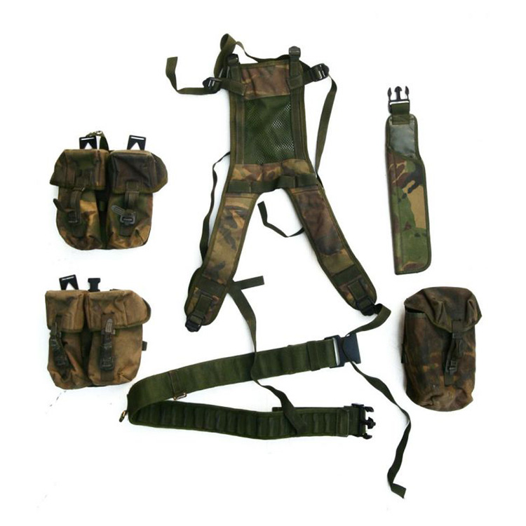 Système de transport provenant des surplus de l'armée britannique, en camouflage DPM. Il comprend une ceinture, des sangles, deux étuis doubles pour chargeurs, un étui pour machette et un étui pour gourde.