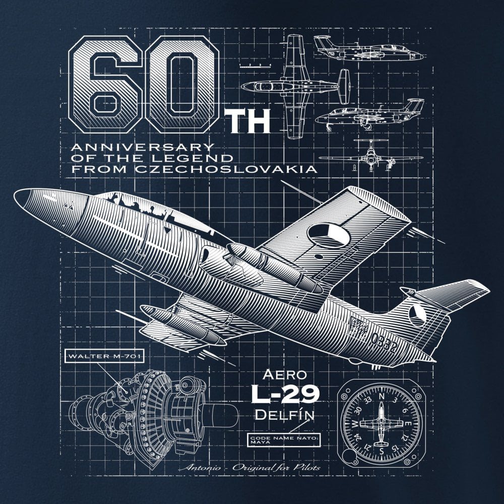 60e anniversaire de la légende tchécoslovaque. T-shirt évoquant les plans techniques de l'icône de l'aviation à réaction. Grammage 200 g/m2. Plus d'informations