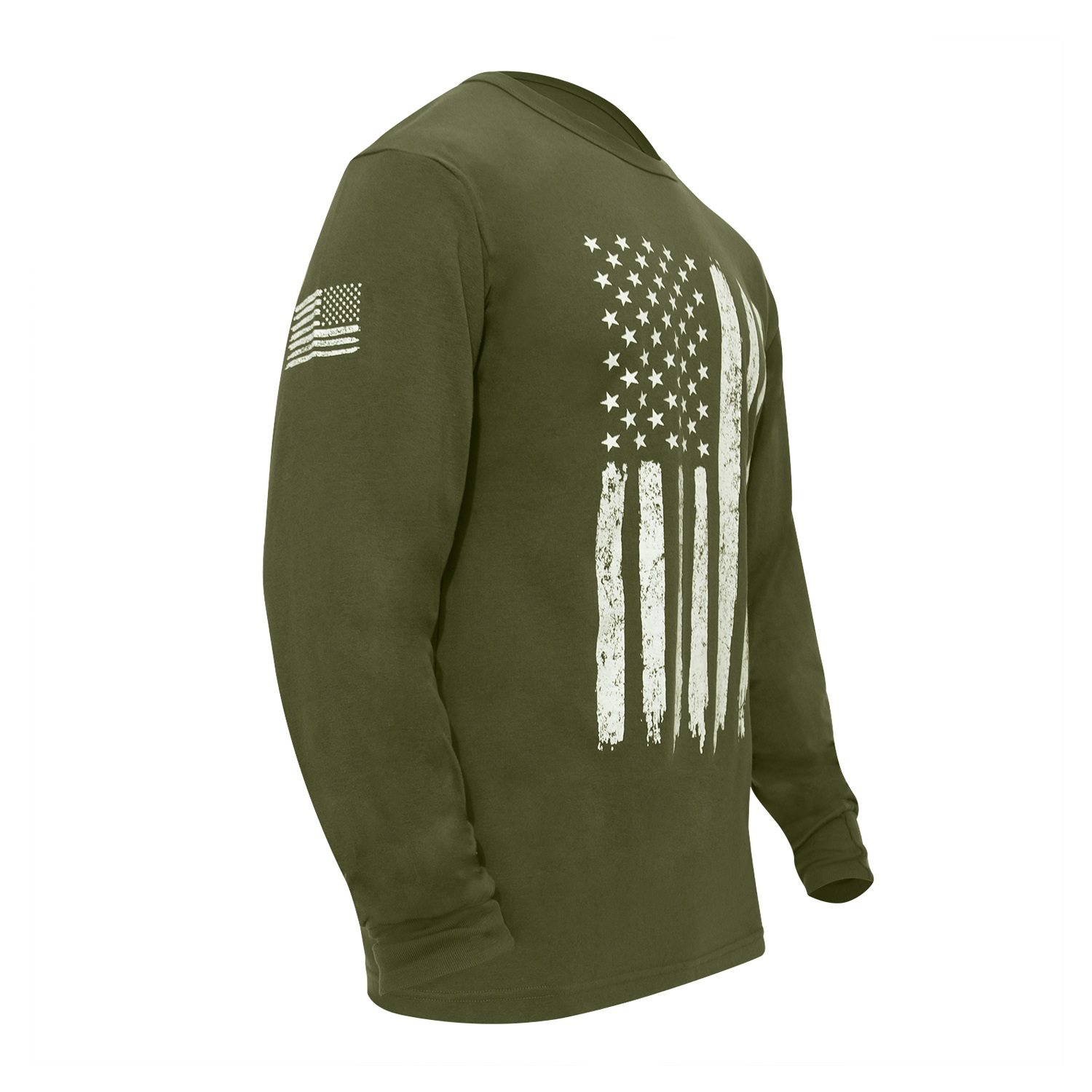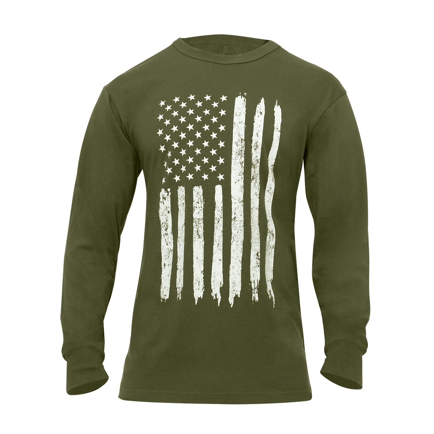 T-shirt à manches longues, avec un grand drapeau américain sur la poitrine, dont les bandes semblent avoir été peintes au pinceau, et un petit drapeau inversé sur la manche droite. Matériau : 60 % coton, 40 % polyester.