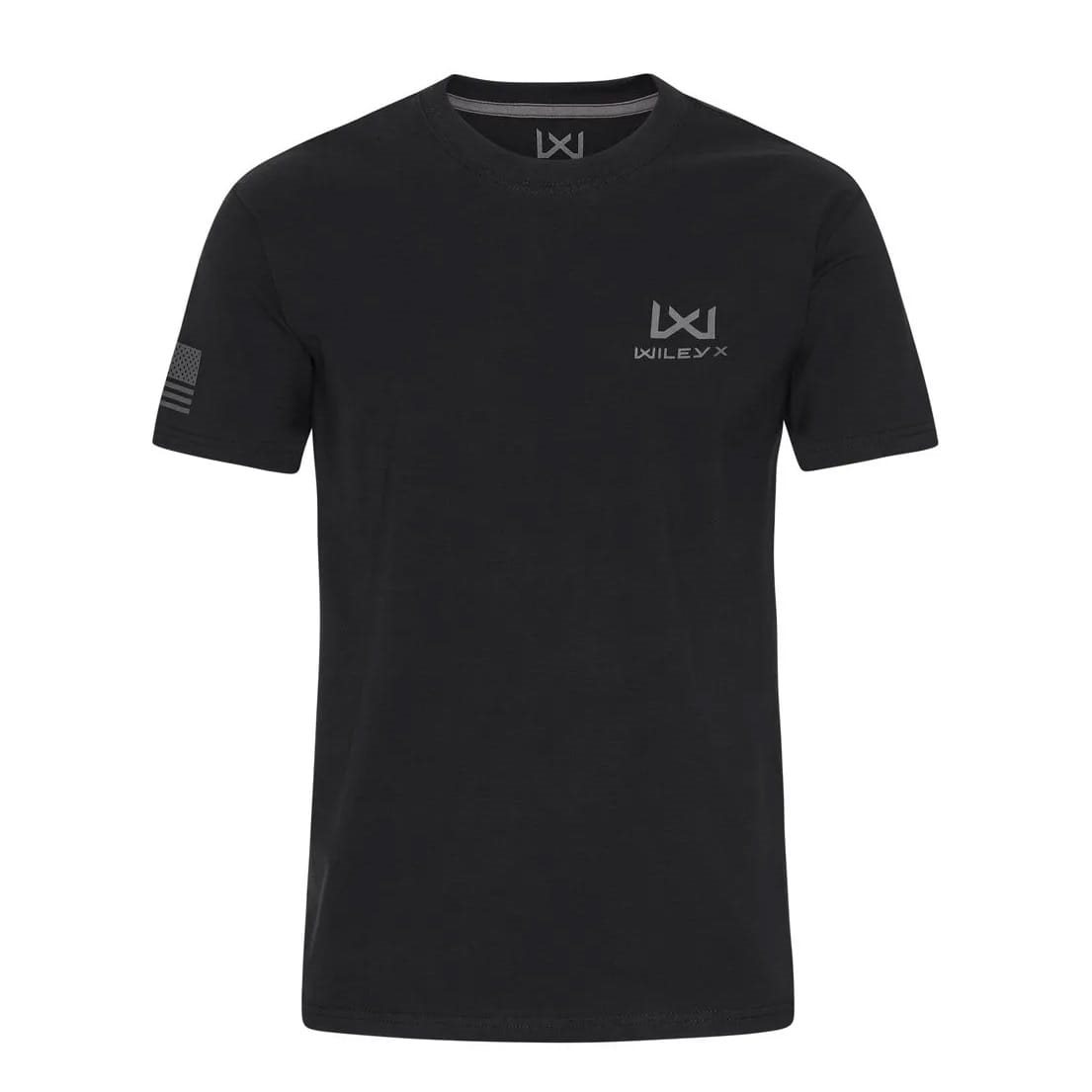 Ce t-shirt est composé à 60 % de coton et à 40 % de polyester, ce qui lui confère une qualité agréable et douce et un confort maximal. Il est orné d'un petit logo WX/Wiley X contrasté sur le côté gauche de la poitrine et d'une étiquette WX dans la couture de l'ourlet inférieur. La manche droite est ornée d'un imprimé représentant le drapeau de combat américain, dont les étoiles sont orientées vers l'avant, comme sur les uniformes américains. Le col rond est légèrement évasé et le bas est légèrement arrondi.