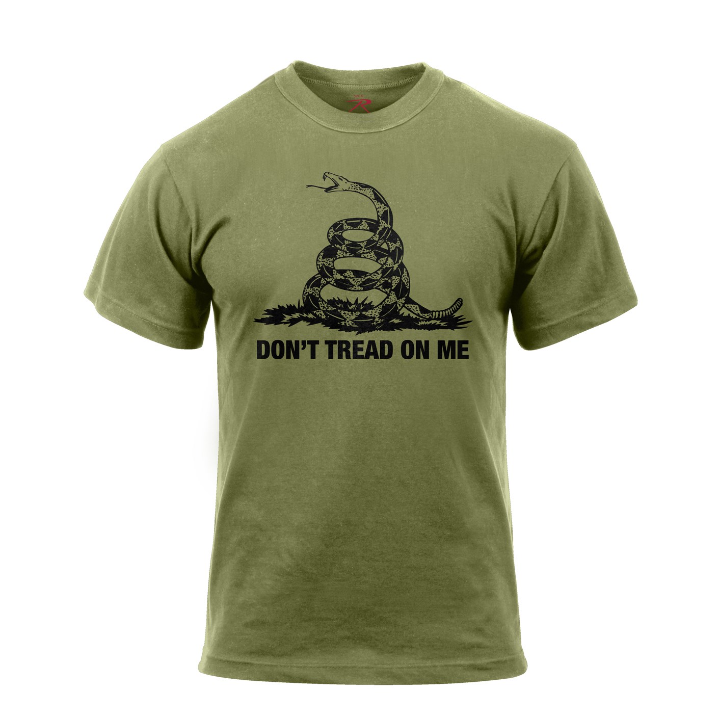 T-shirt avec l'inscription jaune DON'T TREAD ON ME (ne me piétinez pas) et un serpent à sonnettes prêt à attaquer sur la poitrine. L'inscription et l'image du serpent représentent le drapeau historique de Gadsden. Christopher Gadsden a créé ce drapeau en 1775 aux États-Unis pendant la Révolution américaine, qui a abouti à l'indépendance des États-Unis d'Amérique vis-à-vis de l'Angleterre.
