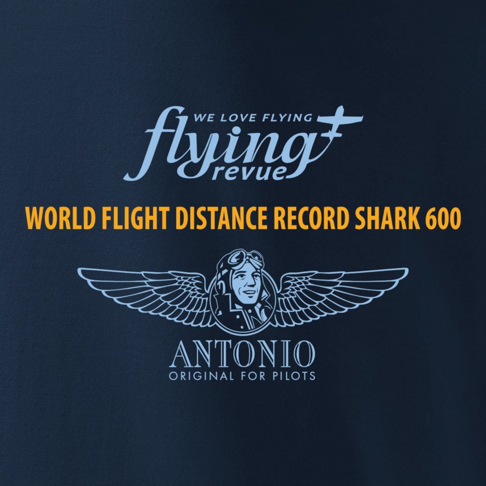 Tentative de record du monde de distance parcourue en avion ultra-léger de moins de 600 kg. T-shirt réalisé en collaboration avec FLYING REVUE. Grammage 200 g/m2. Plus d'informations