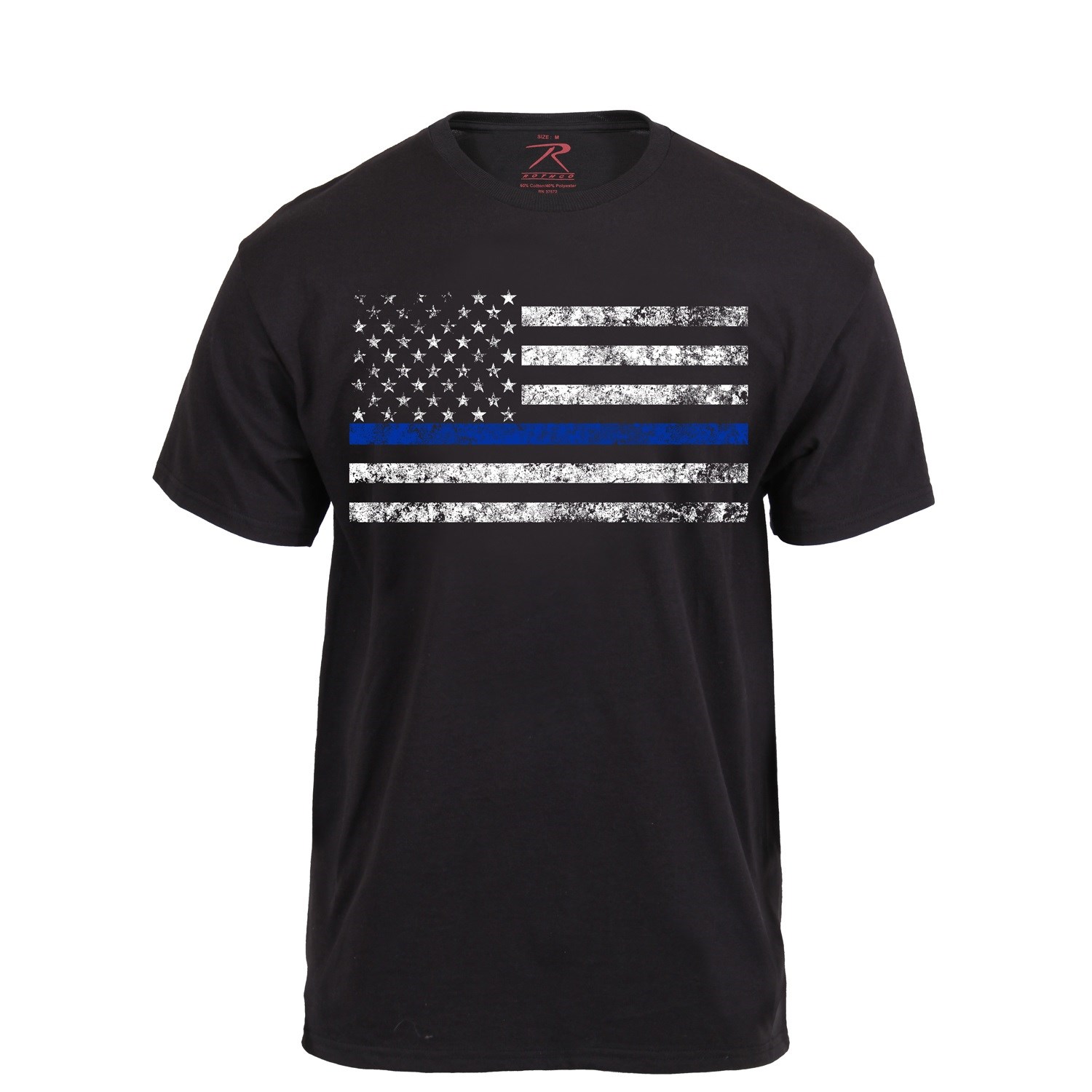 T-shirt à manches courtes, coupe athlétique, avec un grand drapeau américain et une bande bleue. La bande bleue symbolise le soutien aux membres de la police. La coupe athlétique implique un col rapporté, un t-shirt plus large au niveau de la poitrine et des manches légèrement plus larges et plus courtes que celles des t-shirts classiques. Ce t-shirt met particulièrement en valeur une silhouette athlétique. légèrement plus larges et plus courtes que sur les t-shirts classiques. Ce t-shirt met particulièrement en valeur une silhouette athlétique. Composition : 60 % coton, 40 % polyester.