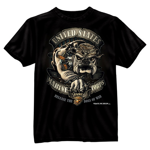 T-shirt noir confortable en coton épais à manches courtes, avec impression recto-verso de qualité représentant le motif US MARINE CORPS - Devil Dog.