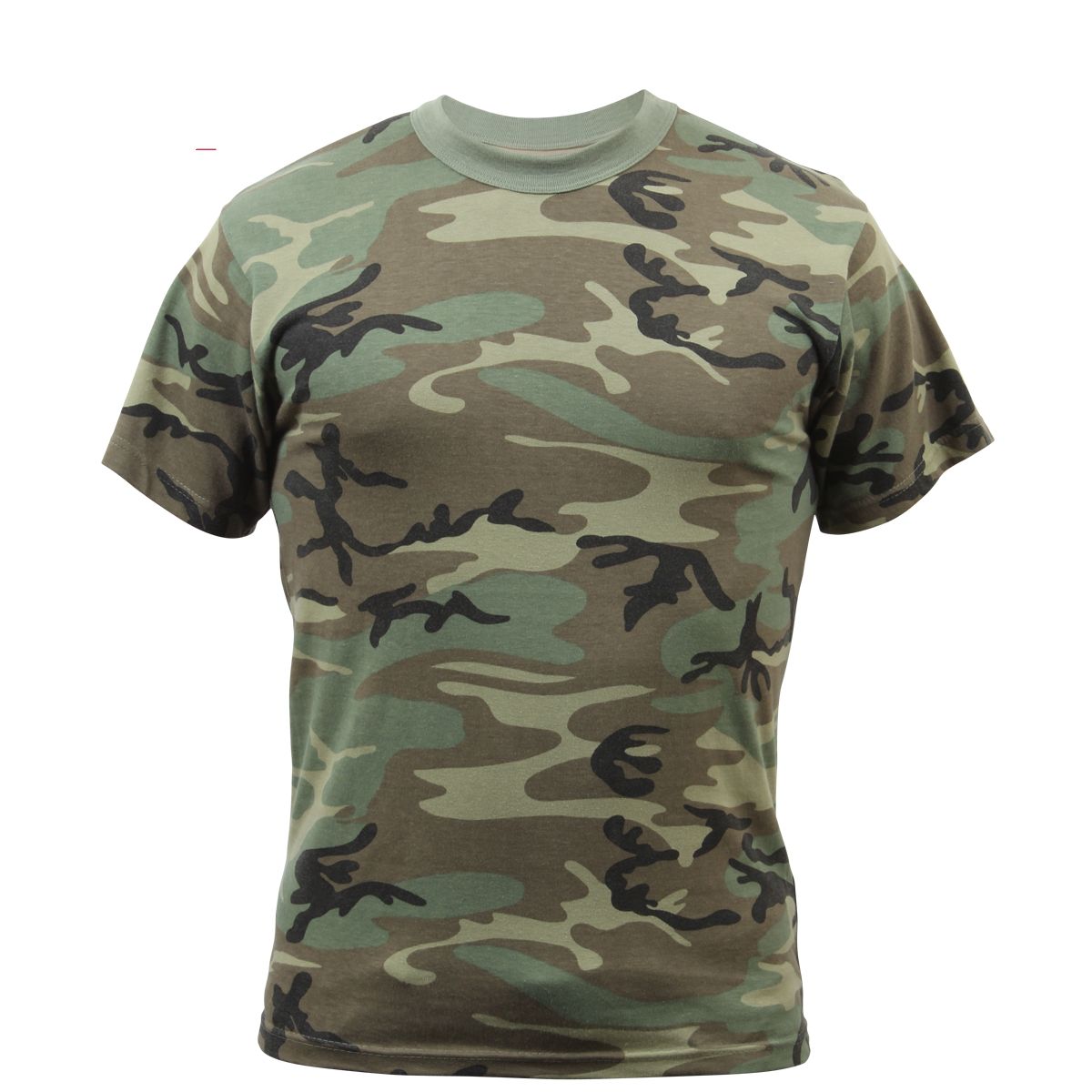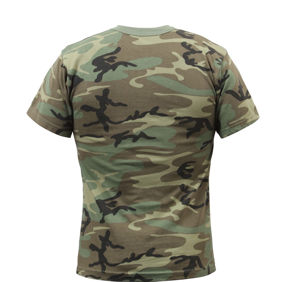 T-shirt militaire de qualité supérieure, modèle camouflage, de la marque Rothco, motif Woodland Camo, aspect délavé vintage.