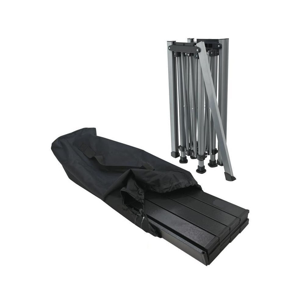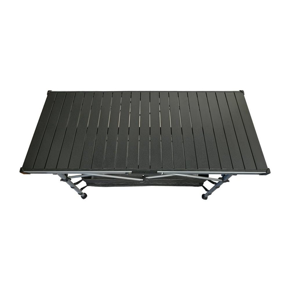 La table est équipée d'un plateau en lamelles d'aluminium de 123 x 55 cm pour une hauteur de 57 cm (* peut être rehaussée de 5 cm sur une surface plane) et offre une capacité de charge maximale de 100 kg pour le matériel, les aliments, etc.