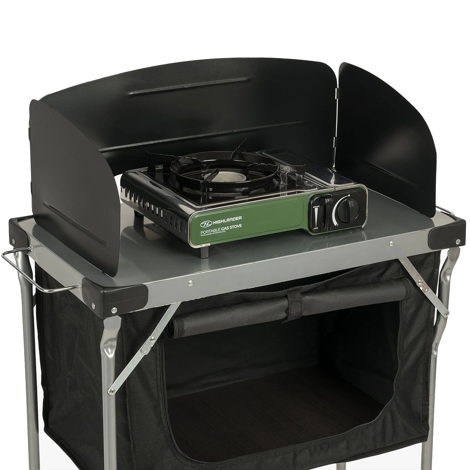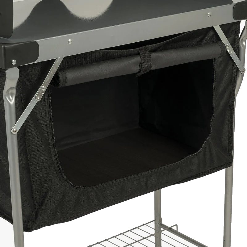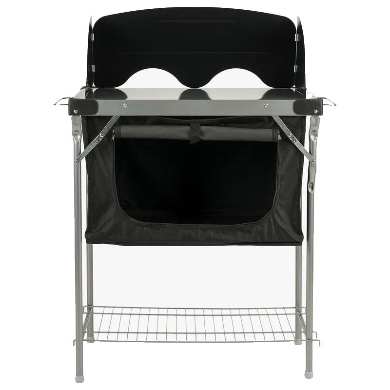Table de camping idéale pour la cuisine. Elle est équipée d'un compartiment de rangement pratique sous la table pour ranger les ustensiles de cuisine et les aliments pendant le camping.