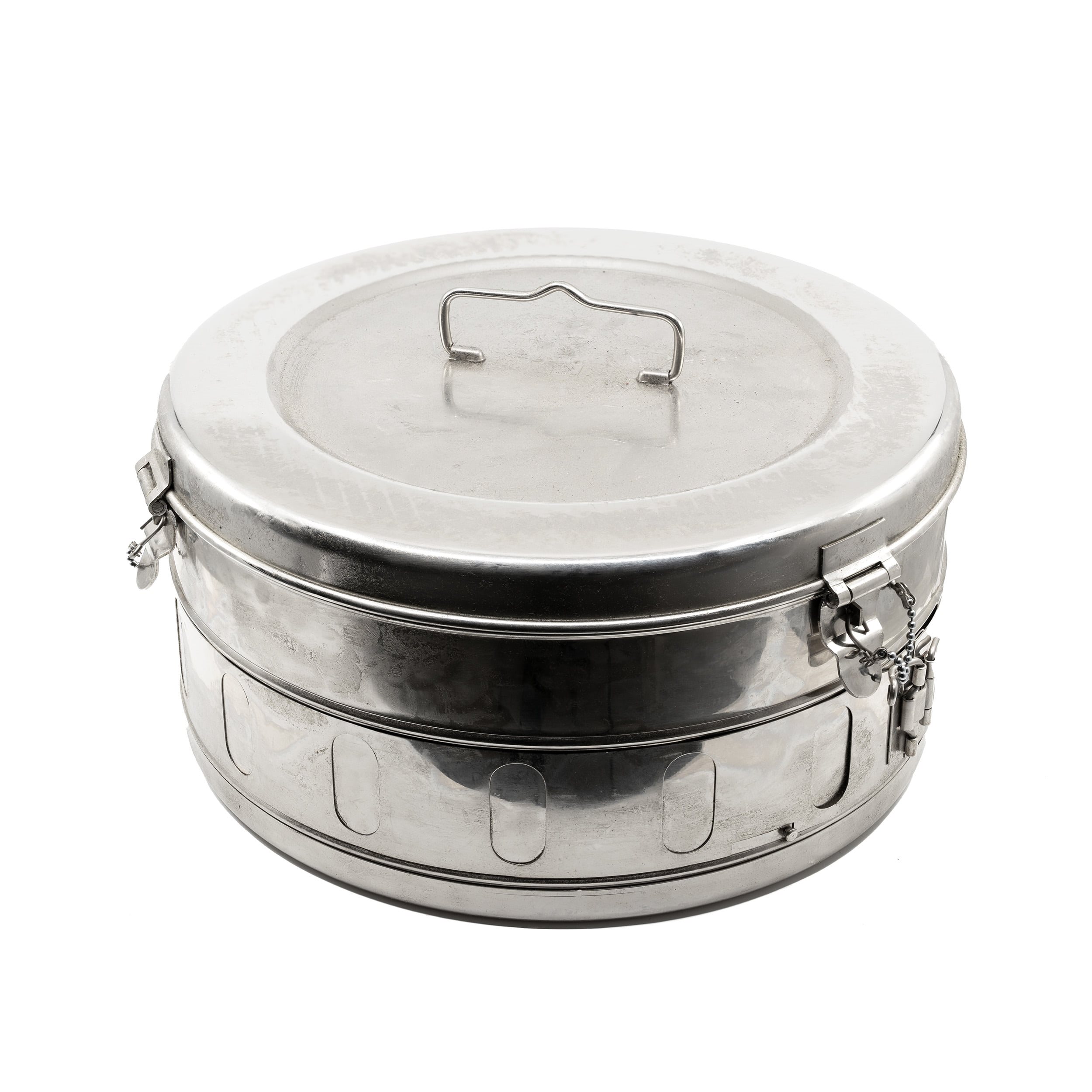 Stérilisateur d'instruments chirurgicaux. Dimensions : 35 x 17 cm. Matériau : acier inoxydable. Produit en stock depuis longtemps, pouvant présenter de légères traces d'utilisation.