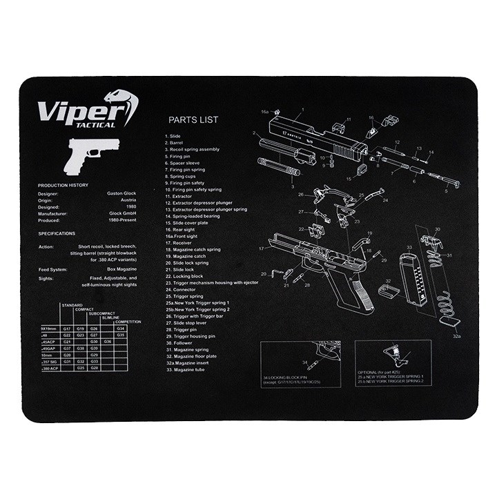 Tout amateur d'armes à feu appréciera ce tapis pratique qui sert de surface de travail pour l'entretien des armes de poing. Pour les propriétaires de la marque Glock, elle est d'autant plus intéressante qu'elle présente la liste complète des pièces du légendaire pistolet Glock, accompagnée de l'historique de sa fabrication et de ses spécifications. Le tapis est fabriqué en caoutchouc d'une épaisseur de 3 mm. Tapis pratique