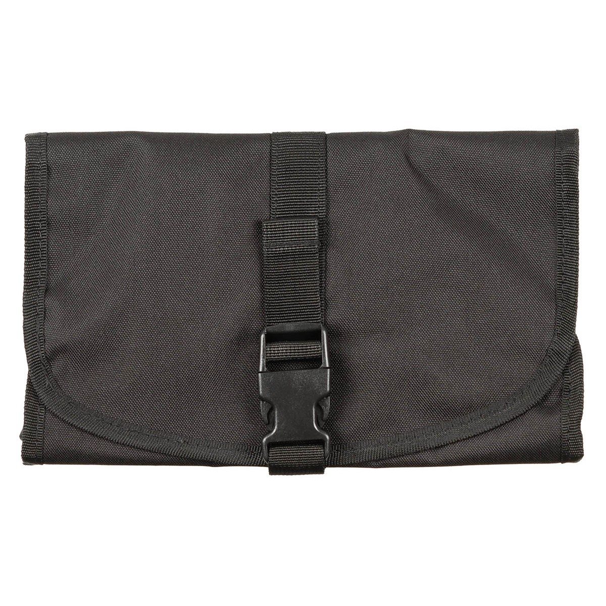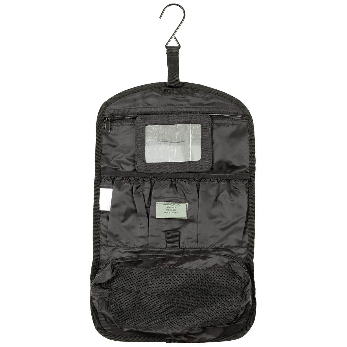 Trousse de toilette avec cinq poches intérieures, miroir en plastique incassable à fermeture velcro, crochet de suspension. Dimensions : 42 x 26 cm (dépliée), 16 x 26 cm (repliée), matière : 100 % polyester.