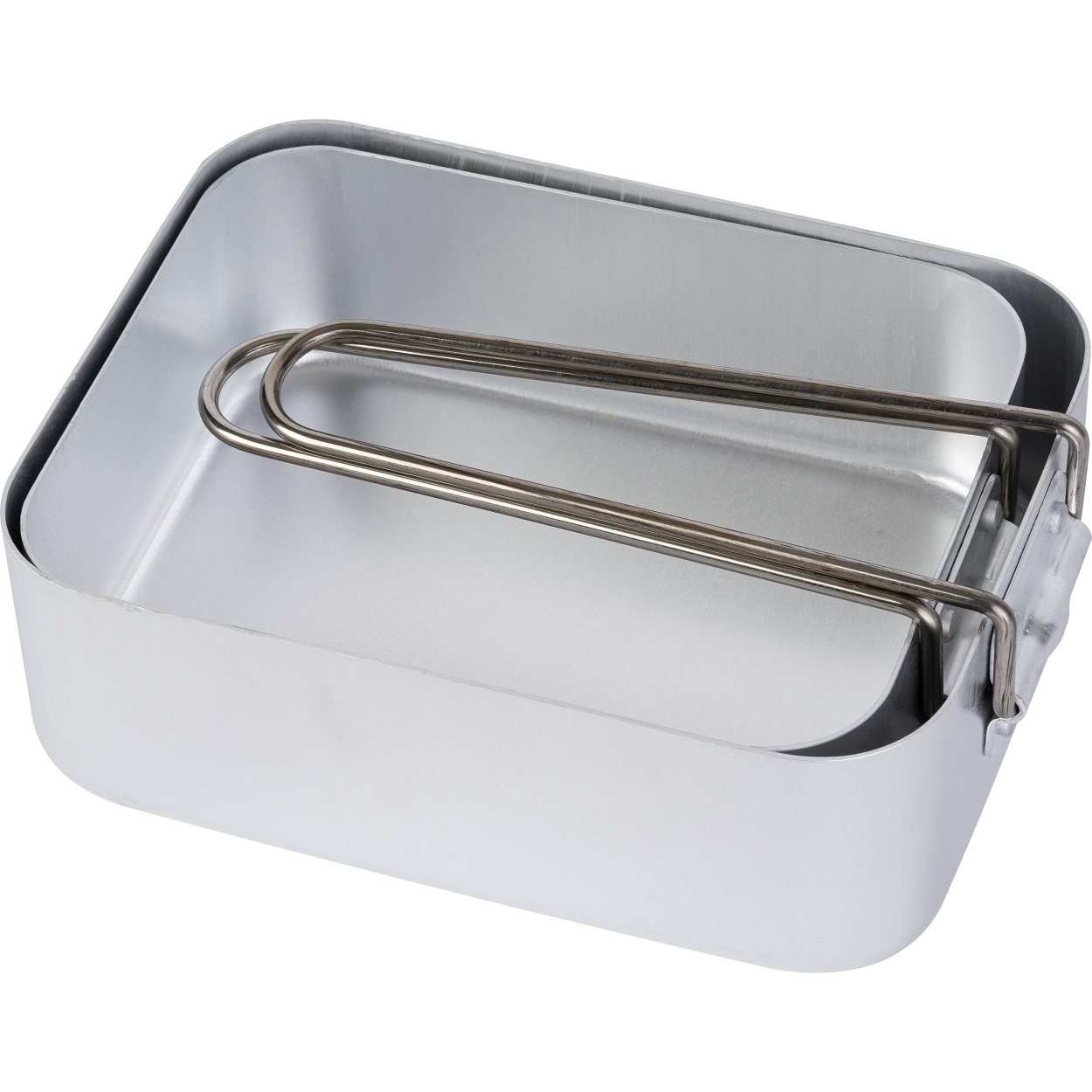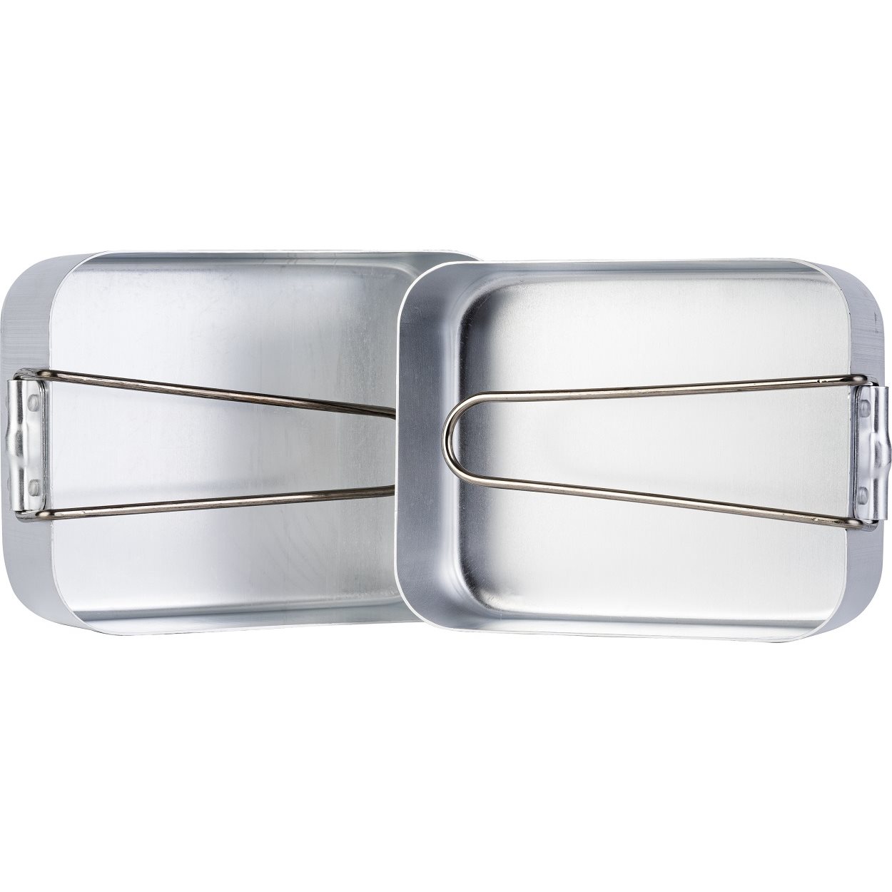 Set de table en aluminium en deux parties avec poignées rabattables. Dimensions : 18,5 x 13,5 x 6 cm et 16,5 x 13 x 5,5 cm. Plus d'informations