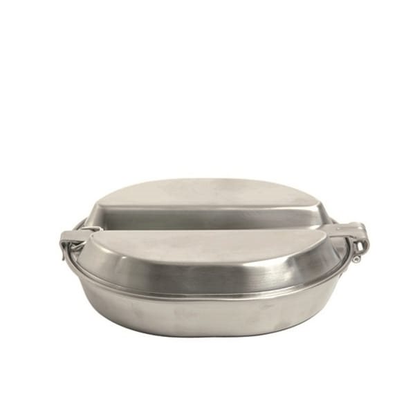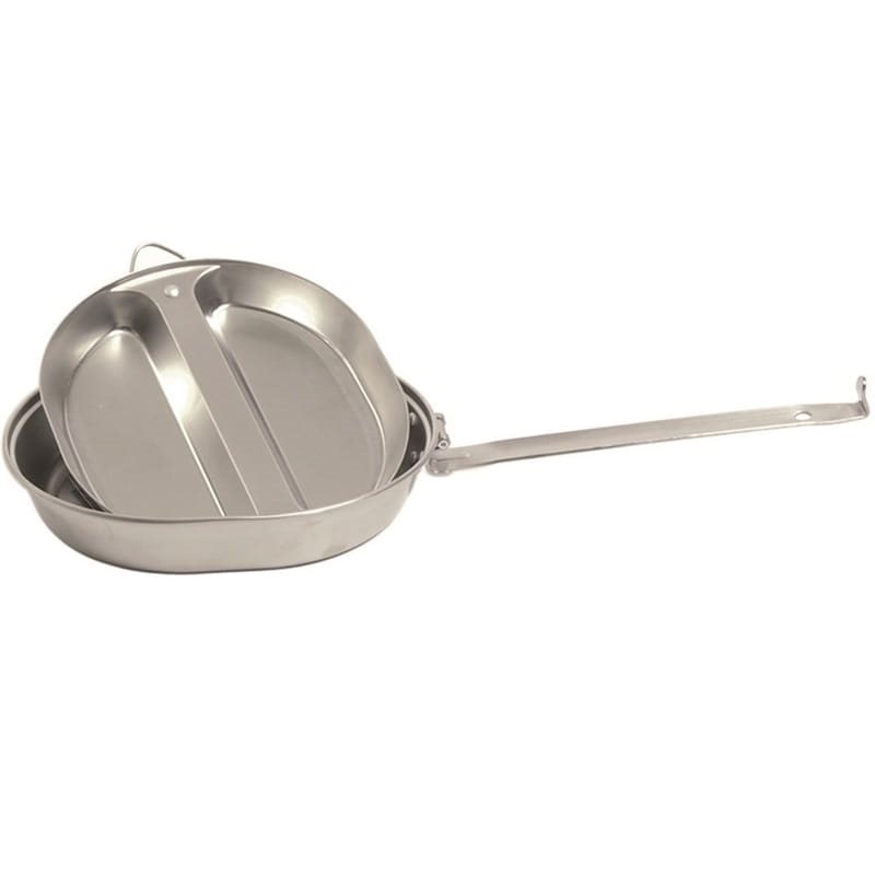 Nouveau set de table en acier inoxydable composé de deux pièces, fabriqué selon le modèle de l'armée américaine. Le set comprend une poêle et une assiette divisée en deux parties. Plus d'informations
