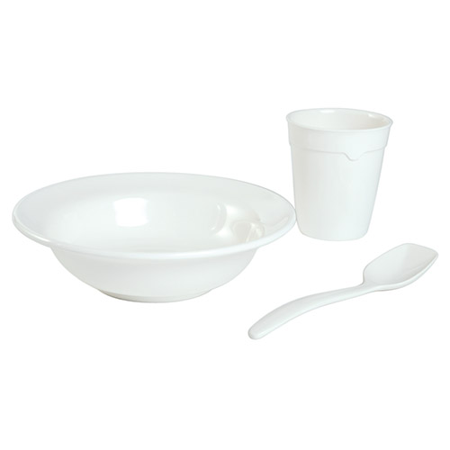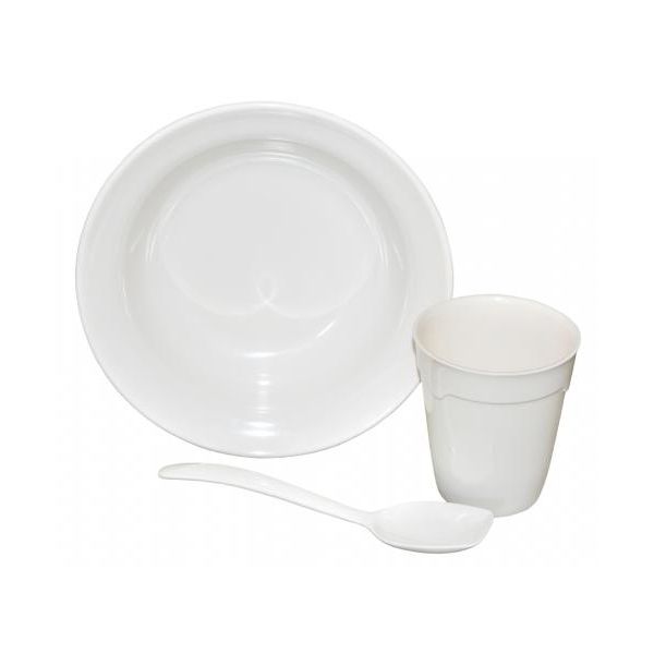 Service de table en plastique pour une personne - assiette, tasse, cuillère. Matériau : mélamine. Plus d'informations