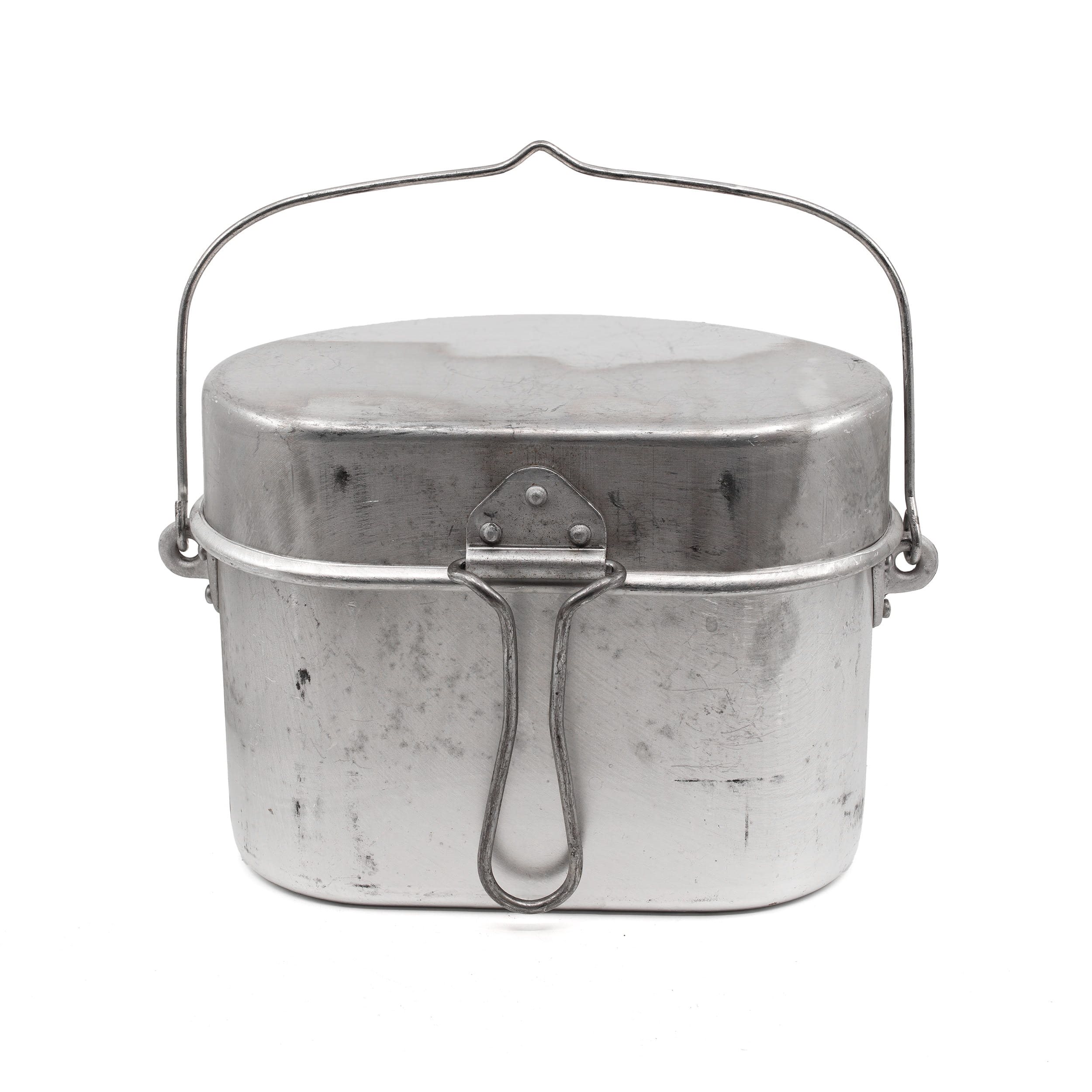 Ancien ensemble de deux casseroles en aluminium de l'armée italienne datant de l'après-guerre. Dimensions : environ 13 x 20 x 14 cm. Produit stocké depuis longtemps. Généralement neuf ou légèrement utilisé, mais présente des signes d'usure dus au stockage et à la manipulation.