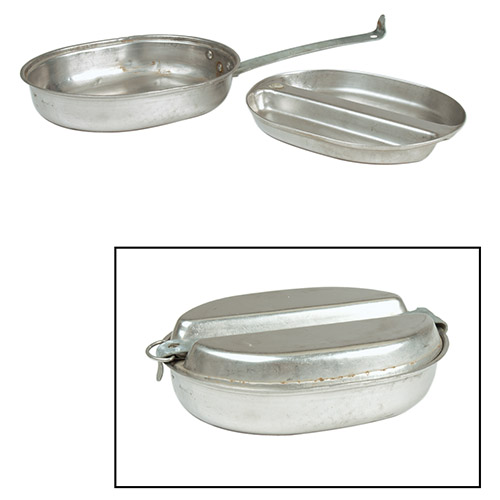 Ensemble de vaisselle en acier inoxydable neuf et original, composé de deux pièces • L'ensemble comprend une poêle et une assiette divisée en deux parties. Plus d'informations