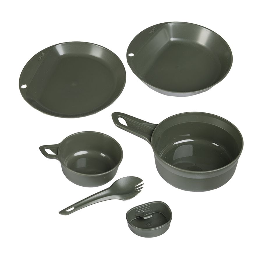 Ensemble de camping pratique composé de six pièces : deux petits bols, deux grands bols, deux assiettes, une tasse et des couverts. Fabriqué en Suède.