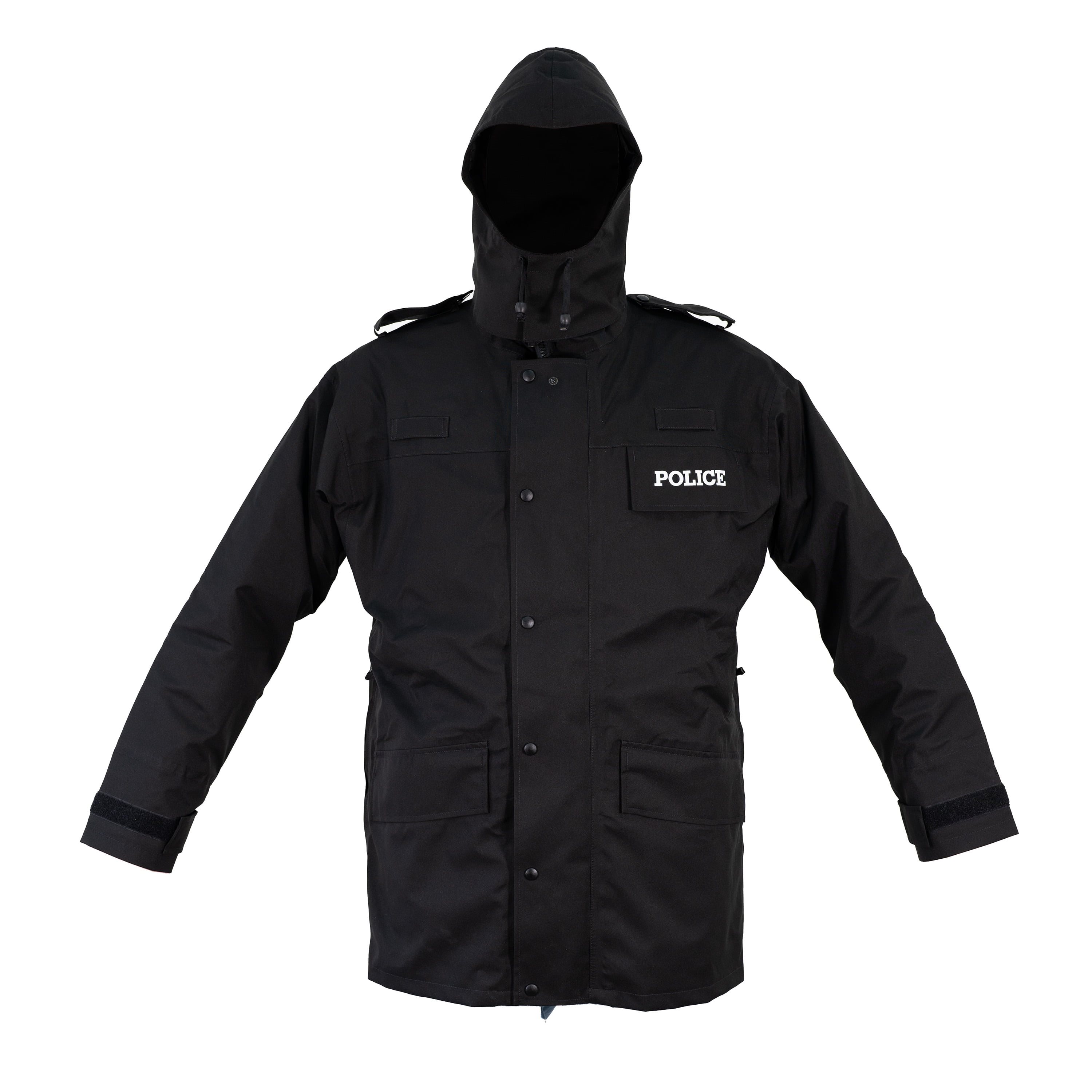 Veste de police britannique originale équipée d'une membrane imperméable et d'une doublure isolante amovible fixée par des fermetures éclair. La veste se ferme à l'aide d'une fermeture éclair à double sens recouverte d'une large patte. Les poches pour les mains sont spacieuses et se ferment à l'aide d'un rabat. La poche poitrine est dotée d'une inscription POLICE sur le rabat. Une dernière poche cachée se trouve à côté de la fermeture éclair centrale. Elle est idéale pour ranger vos objets de valeur, vos documents et autres équipements similaires. La capuche de la veste est réglable en taille, relativement profonde, fermée à l'avant par un bouton-pression et du velcro, et fixée à l'arrière de la veste à l'aide de boutons-pression. Sur les épaules, vous trouverez des bretelles fermées par des boutons-pression. Les extrémités des manches peuvent être ajustées à l'aide de bandes velcro. Les vestes sont en très bon état.