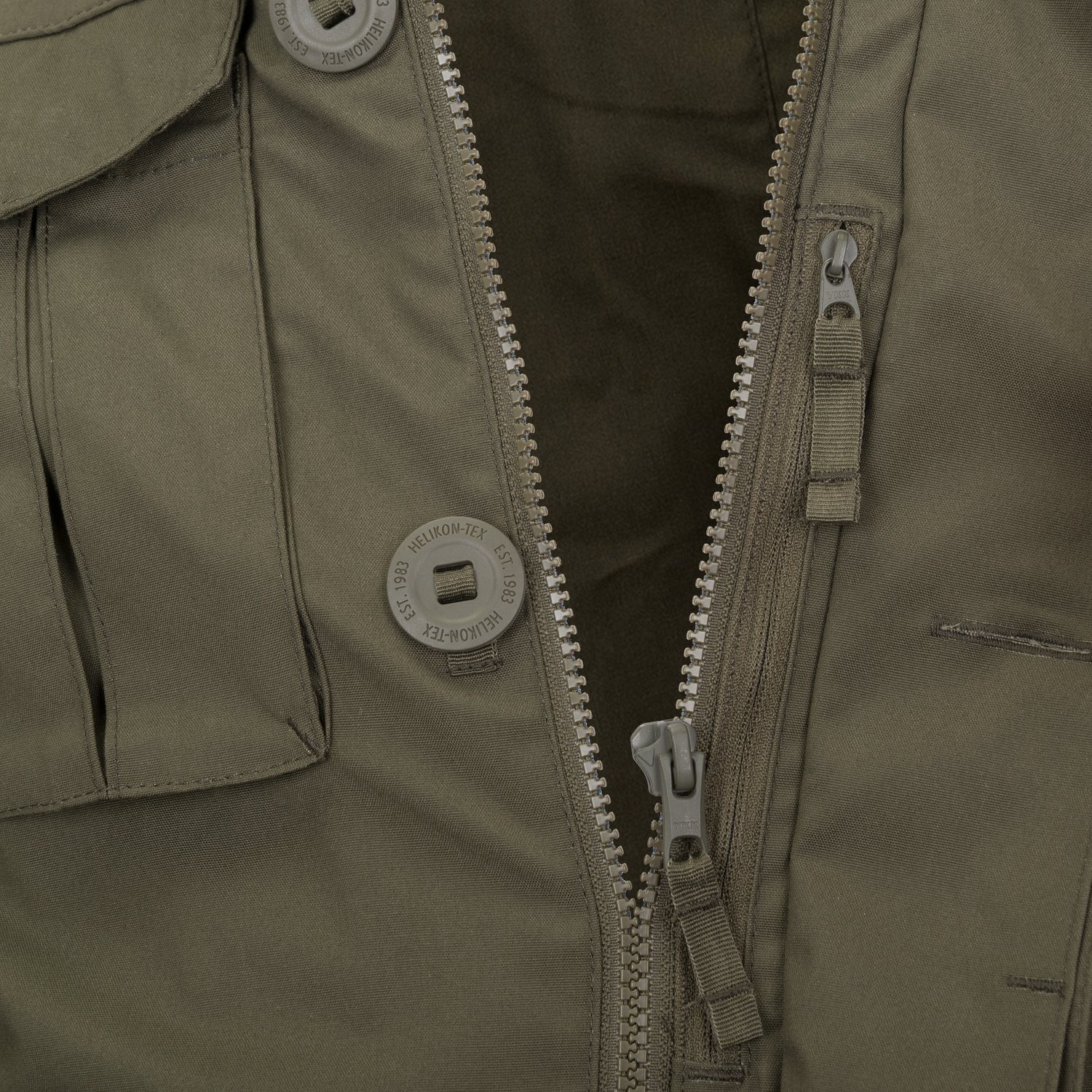 La COVERT M-65 se ferme à l'aide d'une fermeture éclair YKK centrale équipée d'une tirette en tissu. La fermeture éclair est en outre recouverte d'une large patte fermée par des boutons de type canadien. Le col de la veste est montant et muni d'une poche fermée par une fermeture éclair à double sens contenant une capuche réglable. Les poignets des manches sont également réglables à l'aide de bandes en tissu fermées par des boutons.