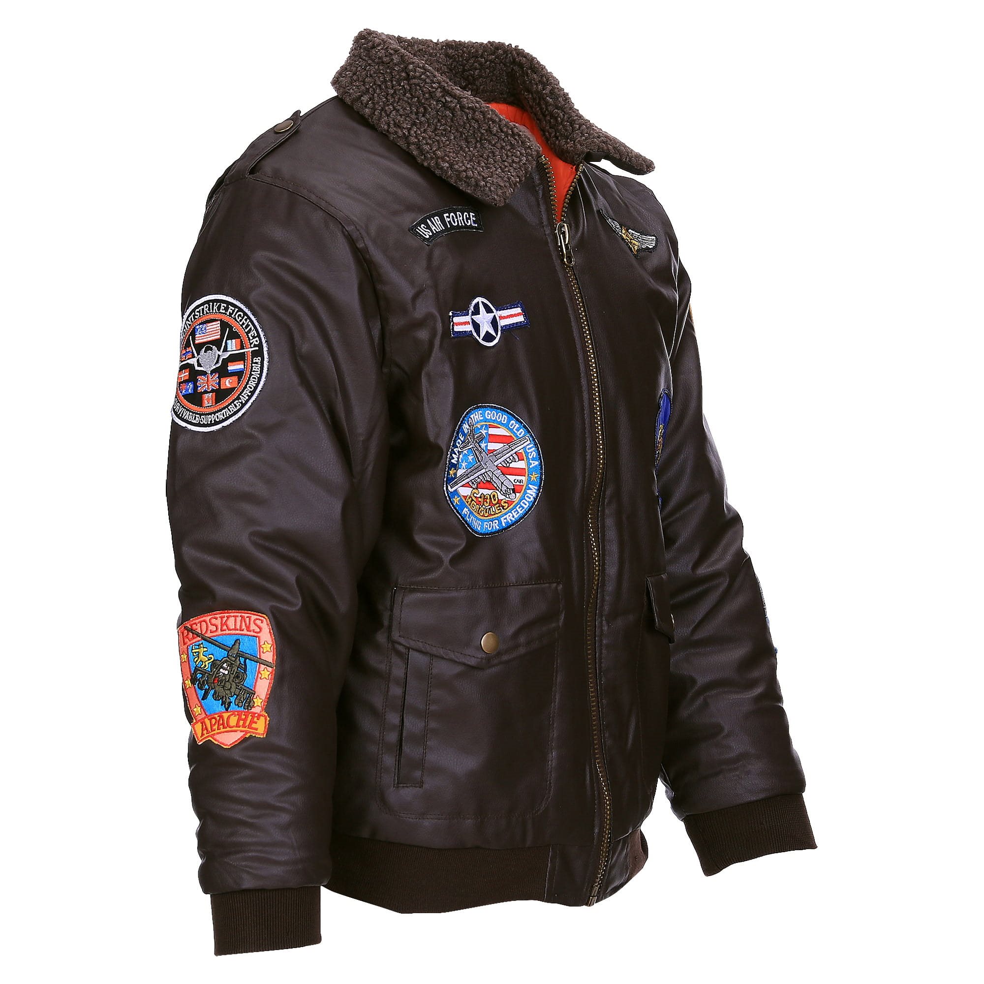 Veste d'aviateur pour enfant inspirée des vestes classiques des pilotes de l'armée de l'air et de la marine américaines. Veste résistante en cuir PU avec divers écussons d'aviation qui lui confèrent un look original. Elle est dotée de deux poches avant et d'un col en fausse fourrure, ce qui la rend idéale pour les journées plus fraîches. Convient pour l'automne et l'hiver.